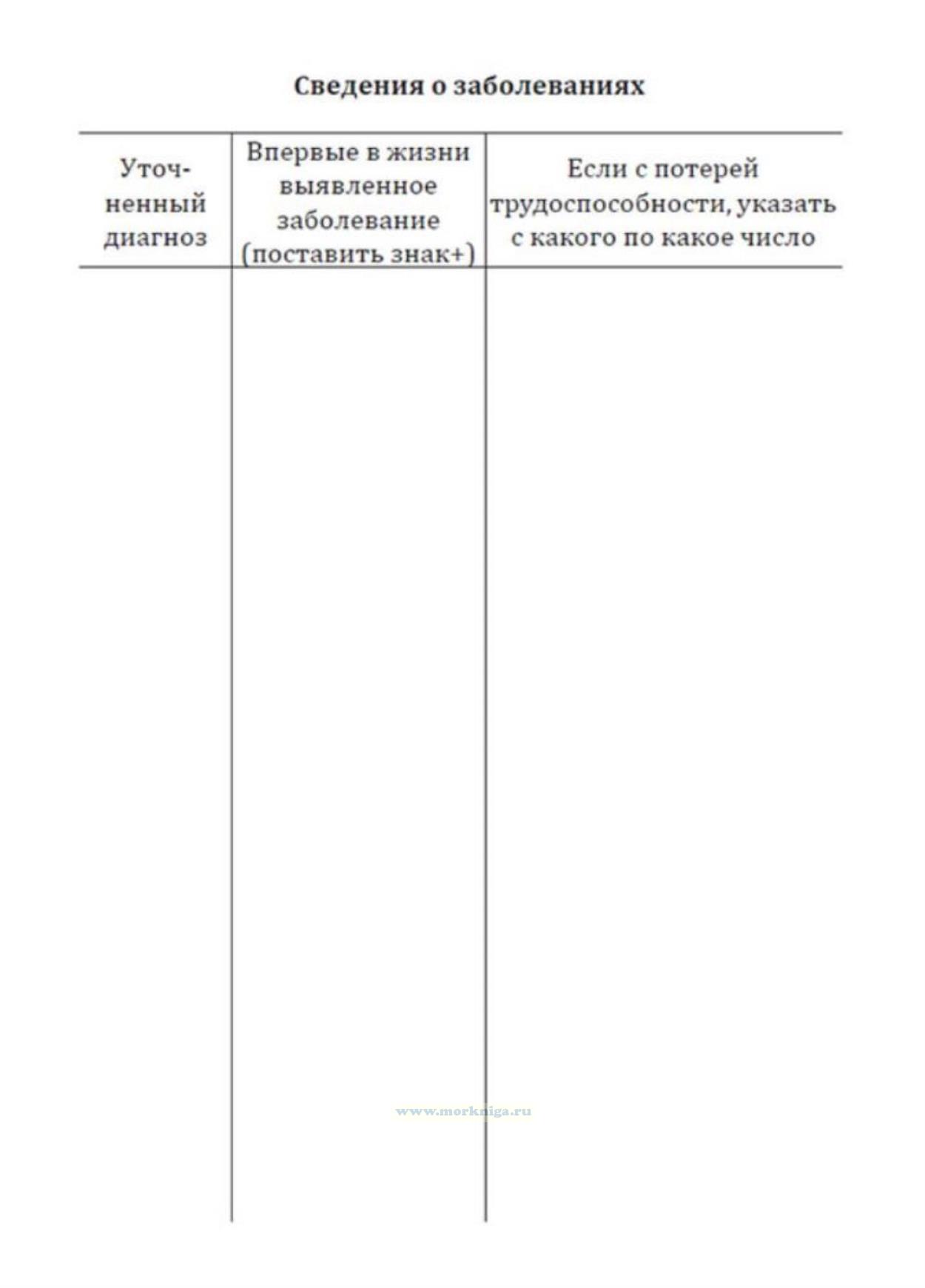 5. В таблицы «Врачебное заключение о состоянии здоровья или периодическом медицинском освидетельствовании» каждый из специалистов, принимавших участие в периодическом медицинском осмотре, в случае выявления у моряка того или иного заболевания вписывает диагноз в соответствующую строку таблицы и заверяет его своей подписью.