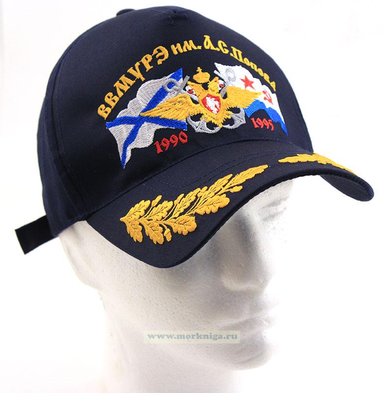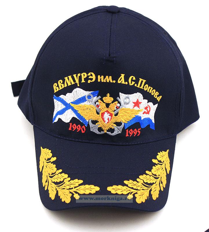 Бейсболка синего цвета с вышитым названием «ВВМУРЭ им. А.С. Попова. 1990-1995», эмблемой Военно-морского Флота, двумя флагами - Андреевским и ВМФ СССР, а также с дубами на козырьке.