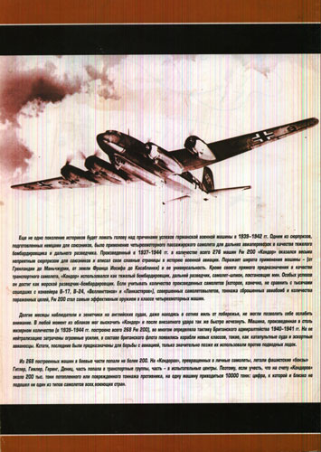 Еще не одно поколение историков будет ломать голову над причинами успехов германской военной машины в 1939-1942 гг. Одним из сюрпризов, подготовленных немцами для союзников, было применение четырехмоторного пассажирского самолета для дальних авиаперевозок в качестве тяжелого бомбардировщика и дальнего разведчика. Произведенный в 1337-1944 гг. в количестве всего 276 машин Fw 200 «Кондор» оказался весьма неприятным сюрпризом для союзников и вписал свои славные страницы в историю военной авиации. Поражает широта применения машины - (от Гренландии до Маньчжурии, от земли Франца Иосифа до Касабланки) и ее универсальность. Кроме своего прямого предназначения в качестве транспортного самолета, «Кондор» использовался как тяжелый бомбардировщик, дальний разведчик, самолет-шпион, постановщик мин. Особых успехов он достиг как морской разведчик-бомбардировщик. Если учитывать количество произведенных самолетов (которое, конечно, не сравнить с тысячами сошедших с конвейера В-17, В-24, «Веллингтонов» и «Ланкастеров»), совершенных самолетовылетов, тоннажа сброшенных авиабомб и количества пораженных целей, Fw 200 стал самым эффективным оружием в классе четырехмоторных машин.