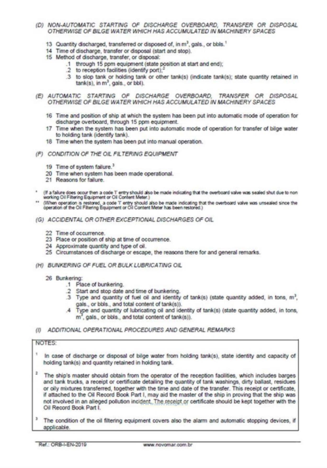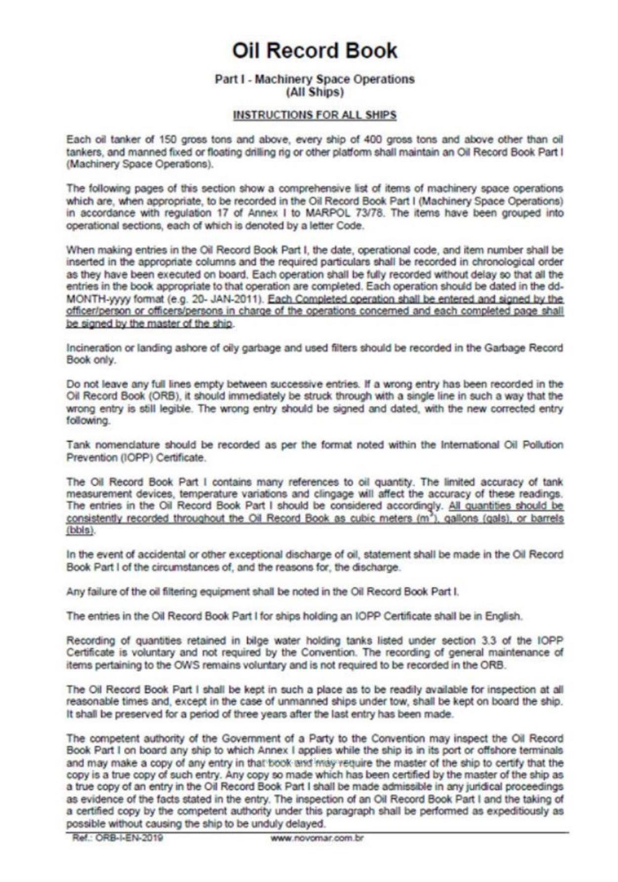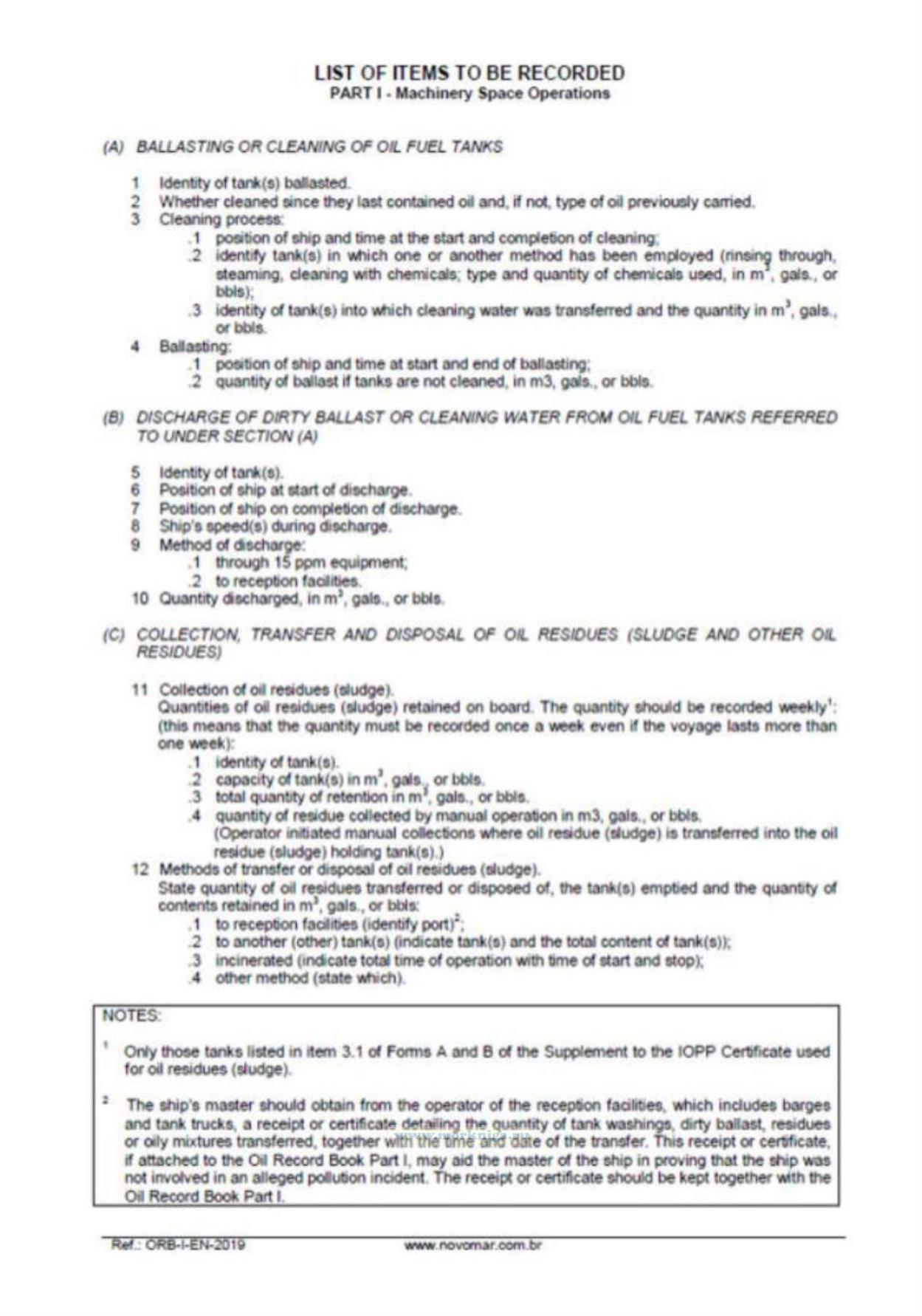 The following pages of this section show a comprehensive list of items of machinery space operations which are, when appropriate, to be recorded in the Oil Record Book Part I (Machinery Space Operations) in accordance with regulation 17 of Annex I to MARPOL 73/78. The items have been grouped into operational sections, each of which is denoted by a letter Code.