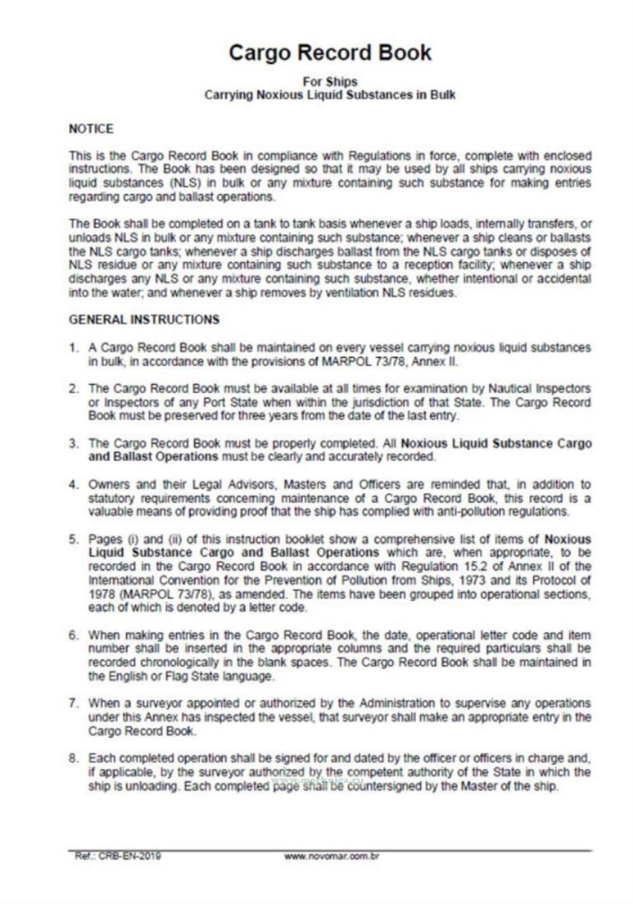 A Cargo Record Book shall be maintained on every vessel canying noxious liquid substances in bulk, in accordance with the provisions of MARPOL 73/78, Annex II.