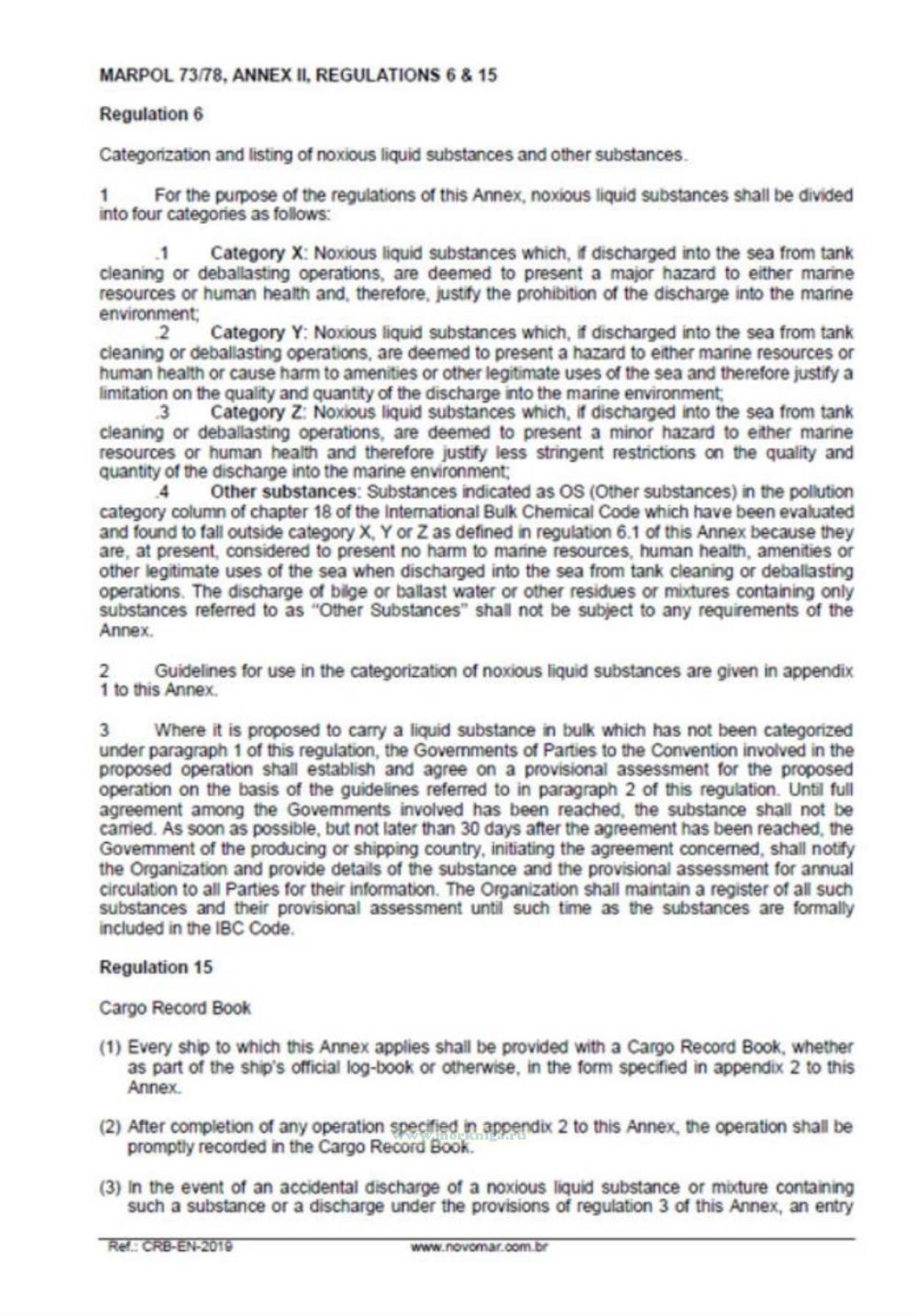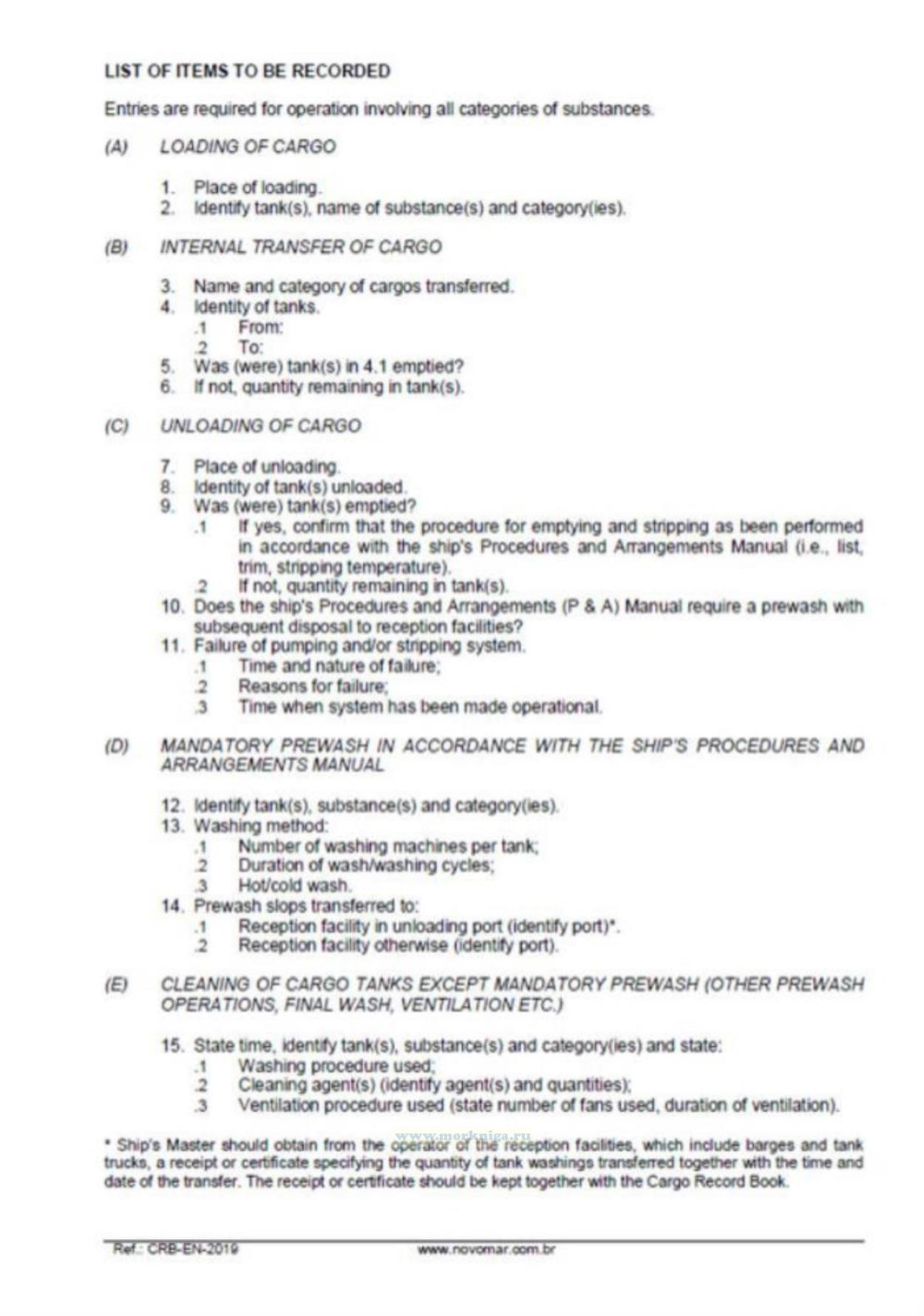 The Book shall be completed on a tank to tank basis whenever a ship loads, internally transfers, or unloads NLS in bulk or any mixture containing such substance; whenever a ship cleans or ballasts the NLS cargo tanks; whenever a ship discharges ballast from the NLS cargo tanks or disposes of NLS residue or any mixture containing such substance to a reception facility; whenever a ship discharges any NLS or any mixture containing such substance, whether intentional or accidental into the water; and whenever a ship removes by ventilation NLS residues.