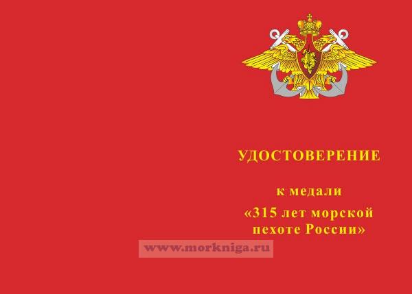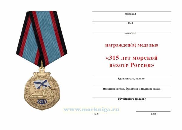 Медаль "315 лет морской пехоте России" продается с незаполненным бланком удостоверения