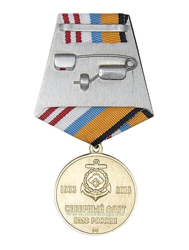 Юбилейная медаль круглой формы. На лицевой стороне изображения авианосца, самолета и подлодки. Сверху развиваются два цветных флага - ВМФ СССР и Андреевский. Снизу ветки лавра, перетянутые лентой с надписью «КСФ. 85». На обратной стороне эмблема СФ ВМФ. Ниже в две строки надпись «Северный флот ВМФ России». С двух сторон от эмблемы памятные даты «1933» и «2018».