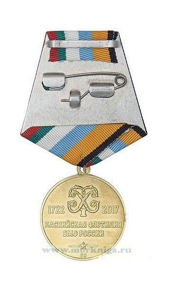 Юбилейная награда имеет круглую форму, диаметром 3,2 сантиметра. Центральный элемент аверса - военный корабль, идущий по морским волнам. Над судном помещена эмблема Каспийской флотилии, по обеим сторонам которой развиваются флаги. Справа - Андреевский, слева - военно-морской флаг СССР. Справа видны ракеты, выпущенные с корабля, и след от них. Ниже корабля две веточки дуба. Между ними небольшой эмалевый коричневый щиток. На нем выгравированы цифры «295». На обороте вензель, с двух сторон от него даты существования Каспийской флотилии: «1722» и «2017». Ниже в 2 строки надпись «Каспийская флотилия ВМФ России», под ними 5-конечная звездочка.