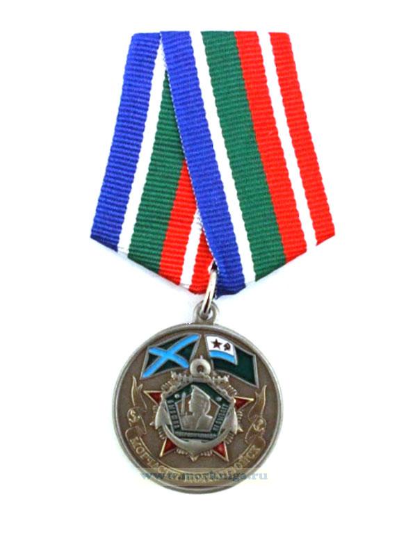 Лицевую сторону награды украшает изображение рубиновой пятиконечной звезды, с наложенным на нее якорем и профилем моряка, под которым находится надпись «Бывших пограничников не бывает», верхняя часть награды содержит два флага, изображенных развевающимися - погранвойск и морчастей. Нижняя же часть медали содержит изображение изогнутой выпуклой ленты с надписью «Морчасти погранвойск», края ленты украшены небольшими якорьками.
