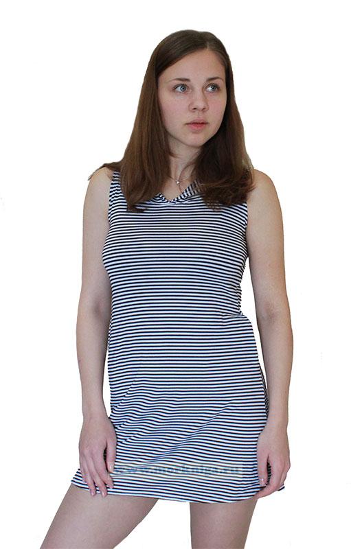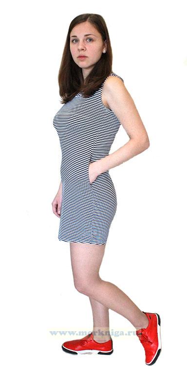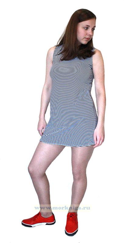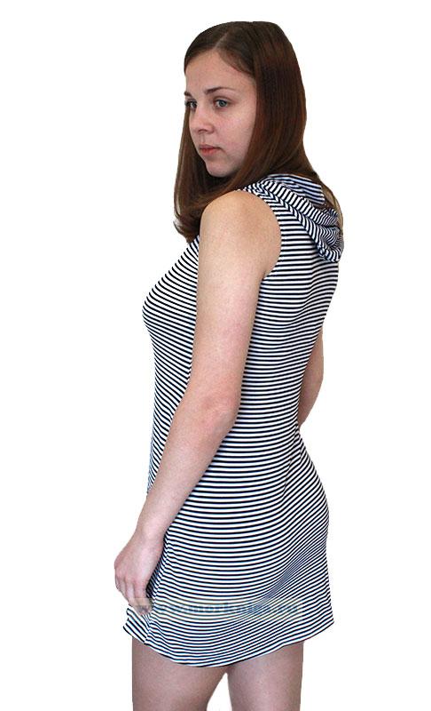 Платье-тельняшка без рукавов, с капюшоном и потайными карманами в тонкую полоску.
