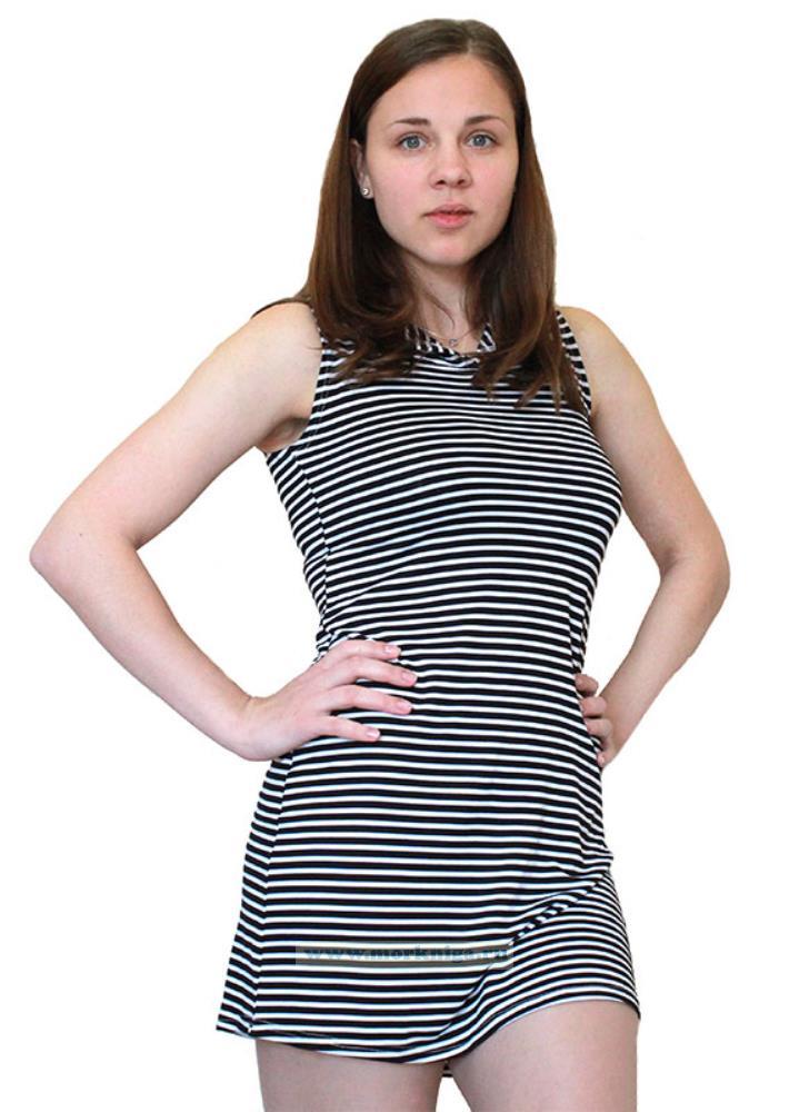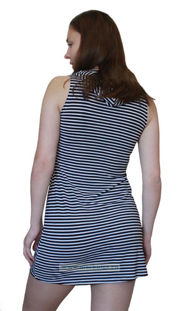 Платье-тельняшка без рукавов, с капюшоном в черно-белую полоску.