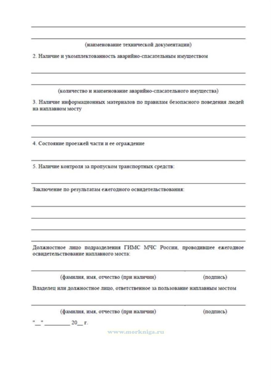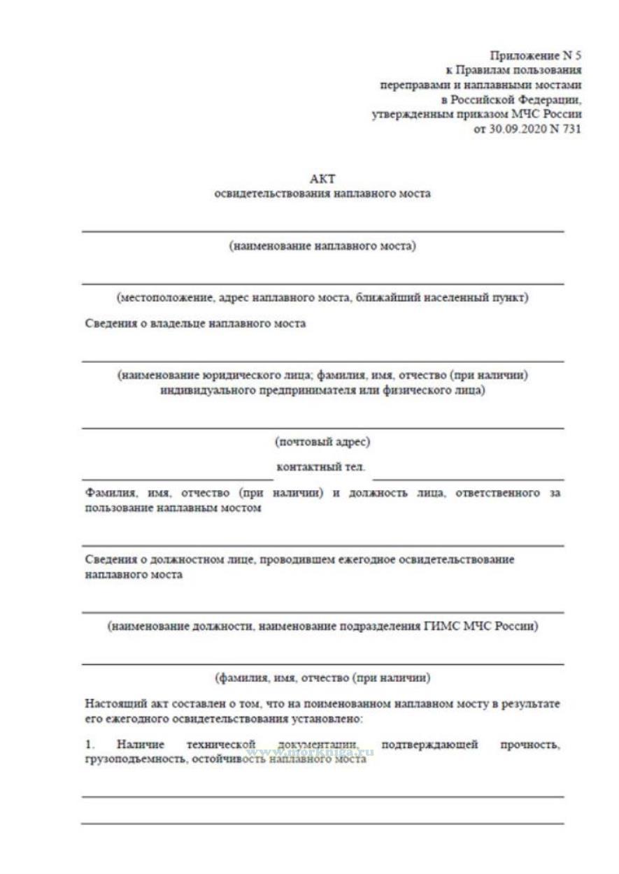 Форма акта соответствует Приложению 5 к "Правилам пользования переправами и наплавными мостами в Российской Федерации". Результаты проведения освидетельствования наплавного моста фиксируют в акте.