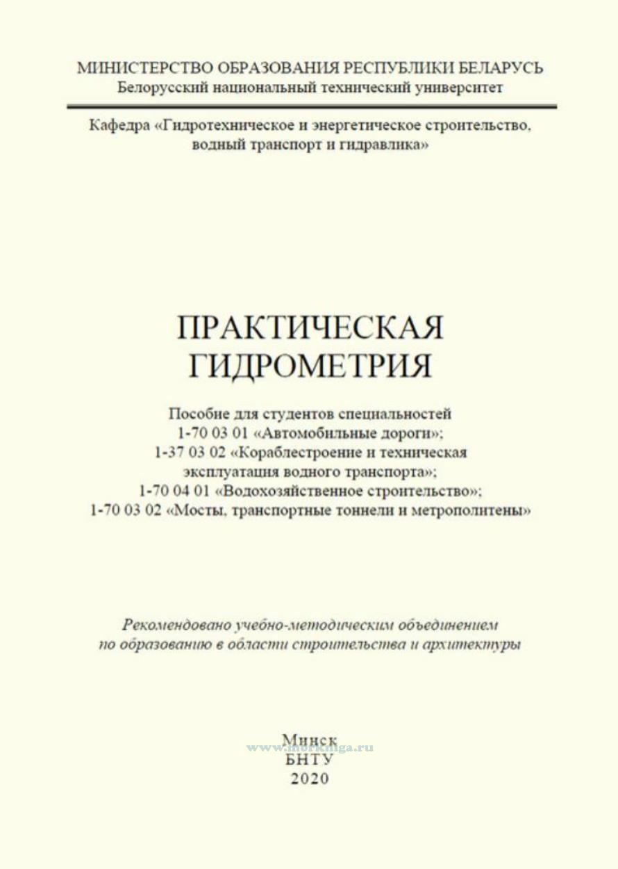 Пособие предназначено для студентов гидротехнических, гидромелиоративных и дорожно-мостовых специальностей, а также специальностей, связанных с водным транспортом, изучающих курс гидрометрии за короткий период прохождения учебной гидрометрической практики, цель которой состоит в ознакомлении студентов с организацией и проведением гидрометрических работ на водотоках Республики Беларусь. В пособии кратко изложены основные сведения по гидрометрии применительно к программе подготовки инженеров вышеназванных специальностей. Наибольшее внимание уделено организации и проведению полевых гидрометрических работ и наблюдению на реках, с которыми инженеру приходится иметь дело, решая вопросы проектирования, строительства и эксплуатации гидротехнических и гидромелиоративных сооружений, дорожно-мостовых водопропускных сооружений, а также объектов водного транспорта. В учебном пособии использовались материалы учебных пособий по гидрометрии разных лет изданий и разных авторов, в том числе Л. Н. Александрова, В. Д. Быкова, А. В. Васильева, А. А. Лутчешевой и т. д.