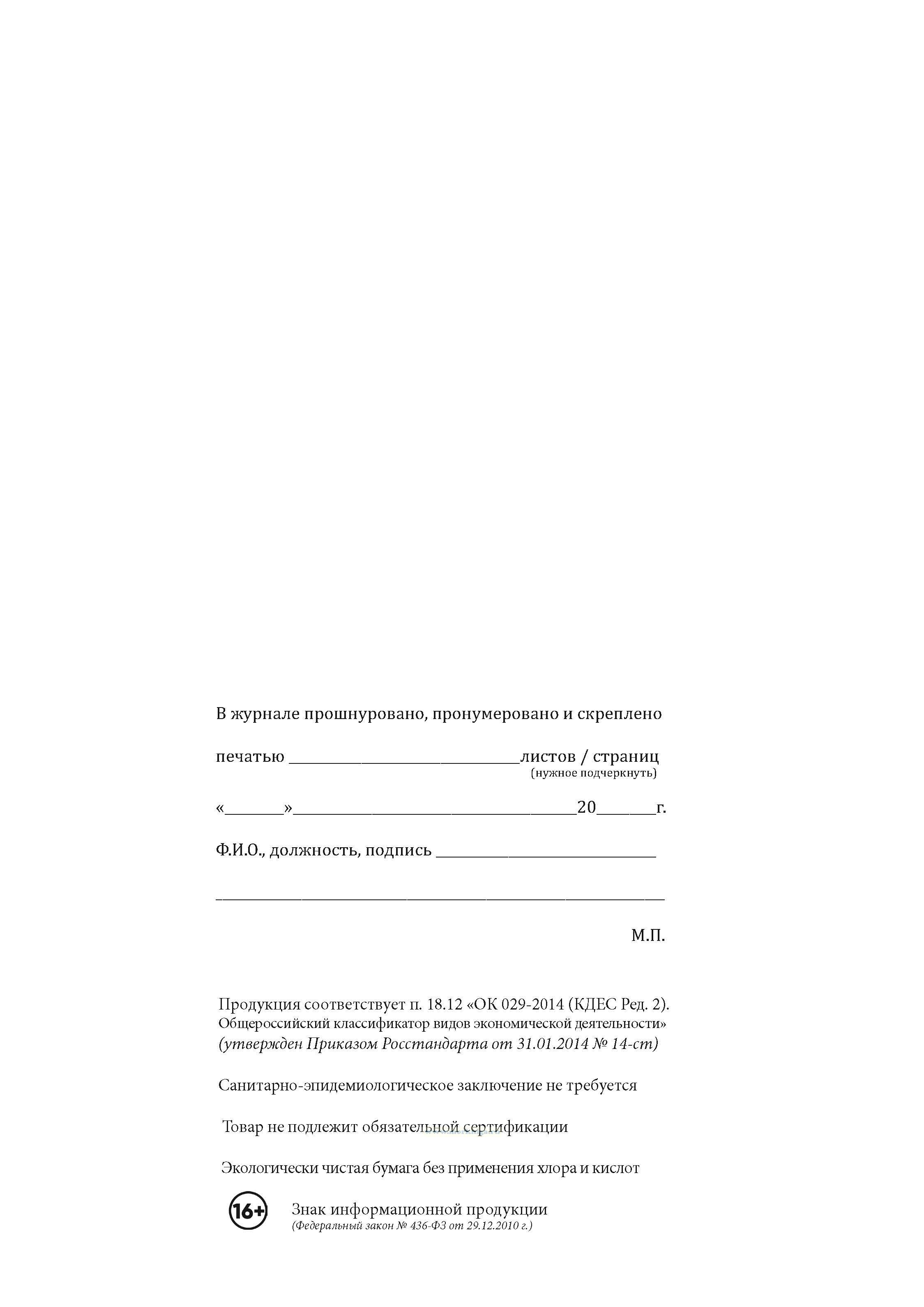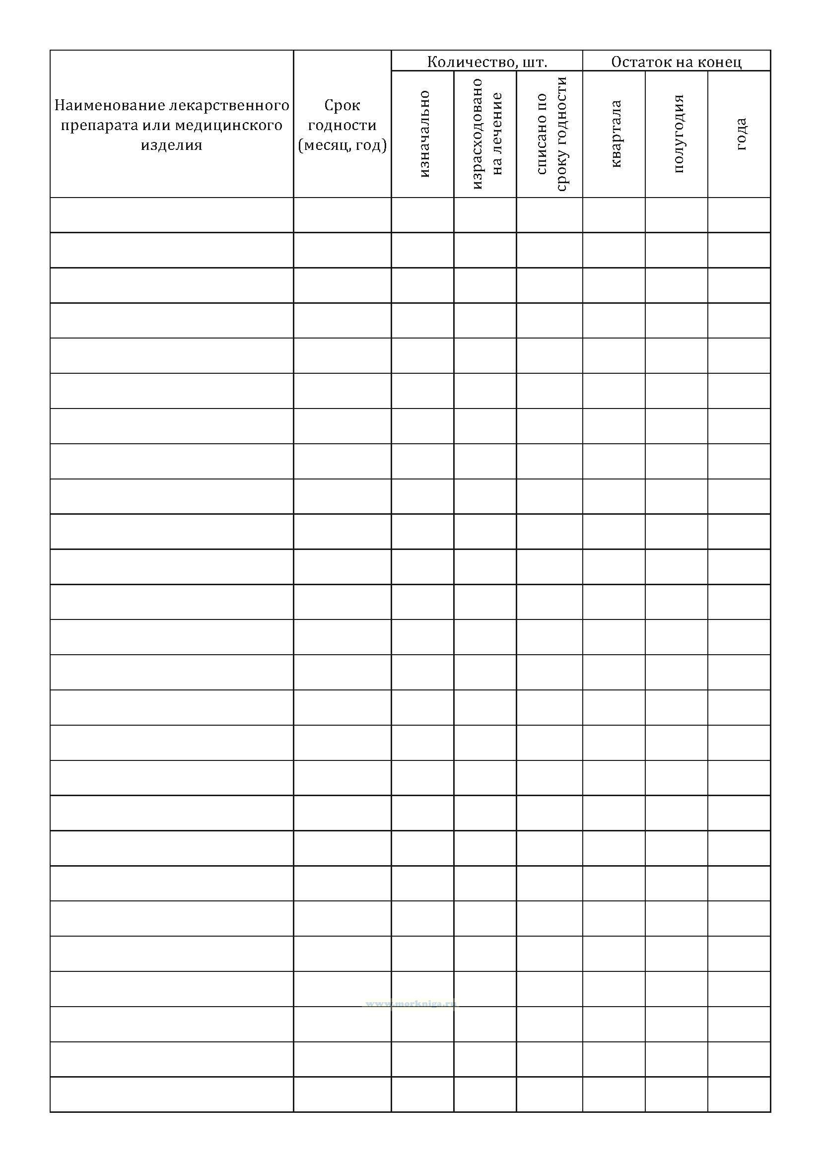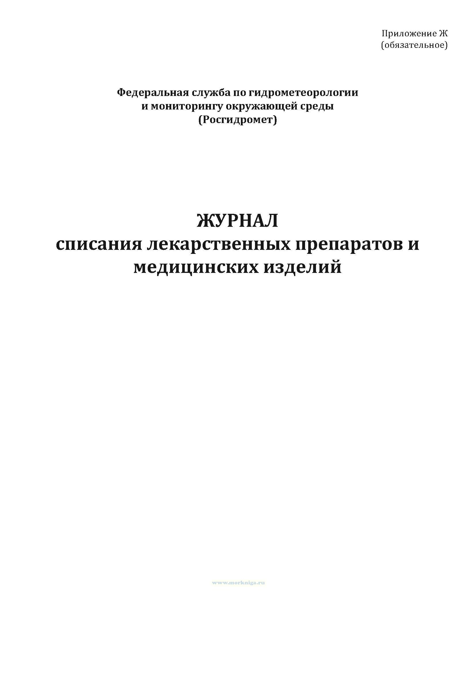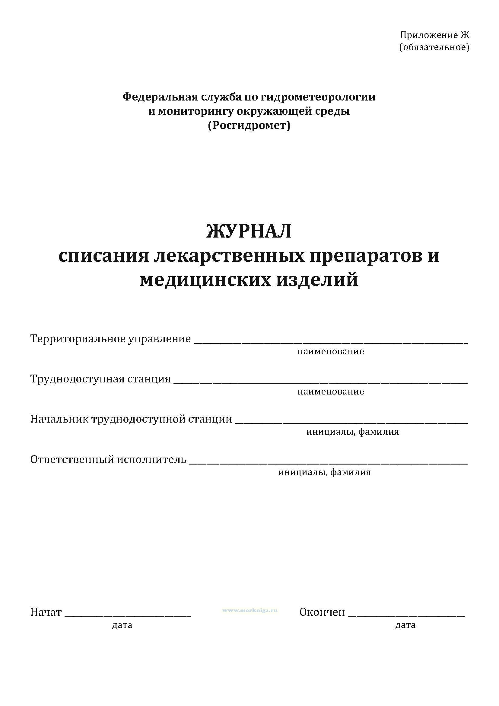 Форма журнала соответствует Приложению И к "РД 52.17.813-2014. Руководящий документ. Оказание первой помощи на труднодоступных станциях Росгидромета". При списании лекарственных препаратов и медицинских изделий делается запись в соответствующий журнал. Журнал списания лекарственных препаратов и медицинских изделий содержит графы: Наименование лекарственного препарата или медицинского изделия Срок годности (месяц, год) Количество, шт. - изначально - израсходовано на лечение - списано по сроку годности Остаток на конец - квартала - полугодия - года