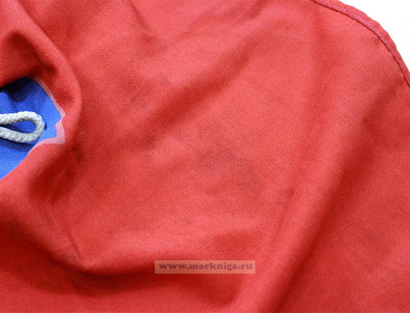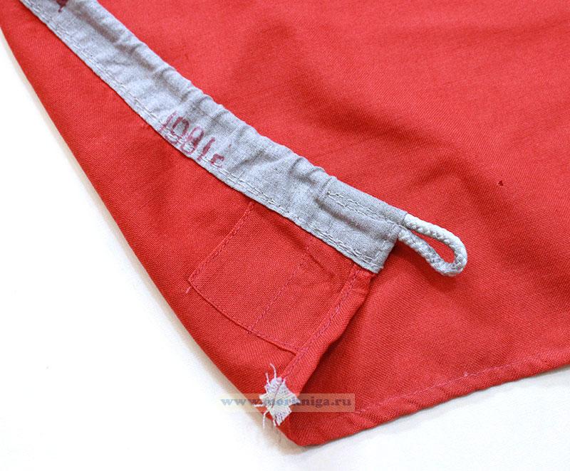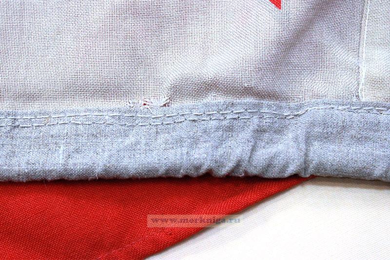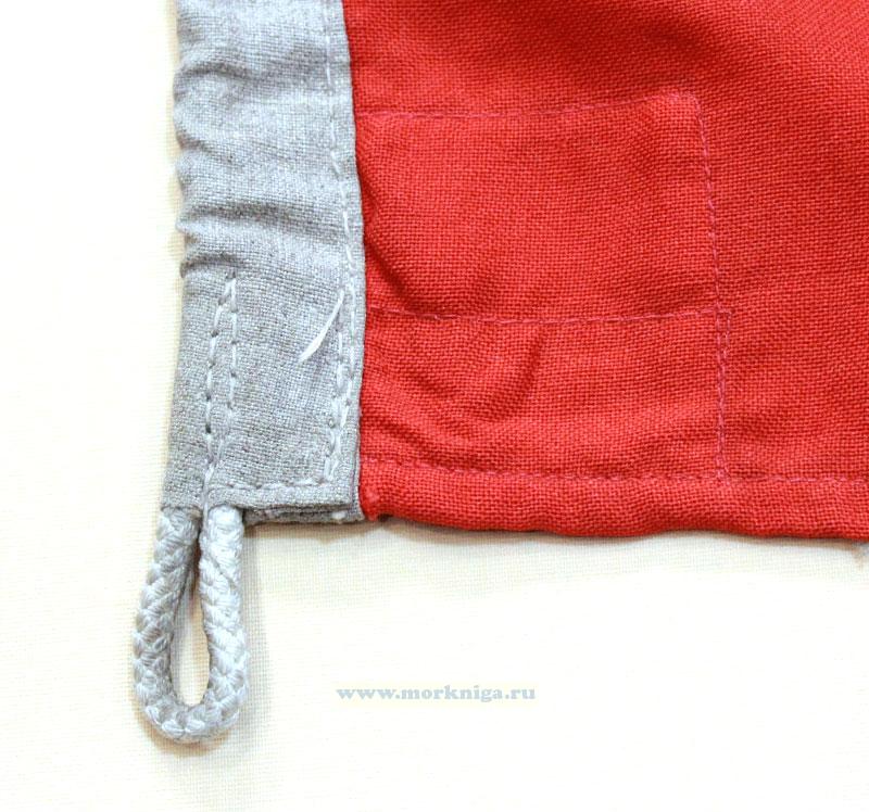 Углы флага прошиты двойной строчкой. В верхний и нижний левый угол вшиты петли, предназначенные для крепления флага на флагштоке или мачте судна.