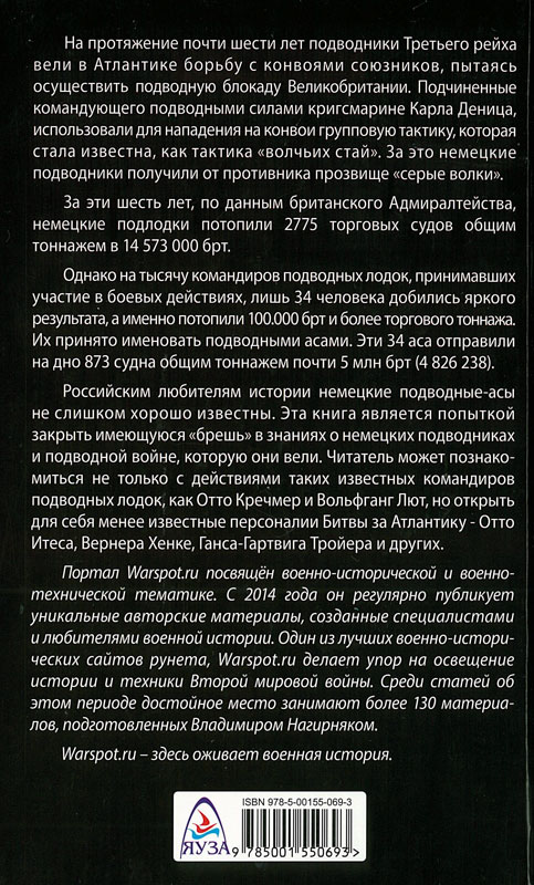 Российским любителям истории немецкие подводные асы не слишком хорошо известны. Эта книга является попыткой закрыть имеющуюся «брешь» в знаниях о немецких подводниках и подводной войне, которую они вели. Читатель может познакомиться не только с действиями таких известных командиров подводных лодок, как Отто Кречмер и Вольфганг Лют, но открыть для себя менее известные персоналии Битвы за Атлантику - Отто Йтеса, Вернера Хенке, Ганса-Гартвига Тройера и других.