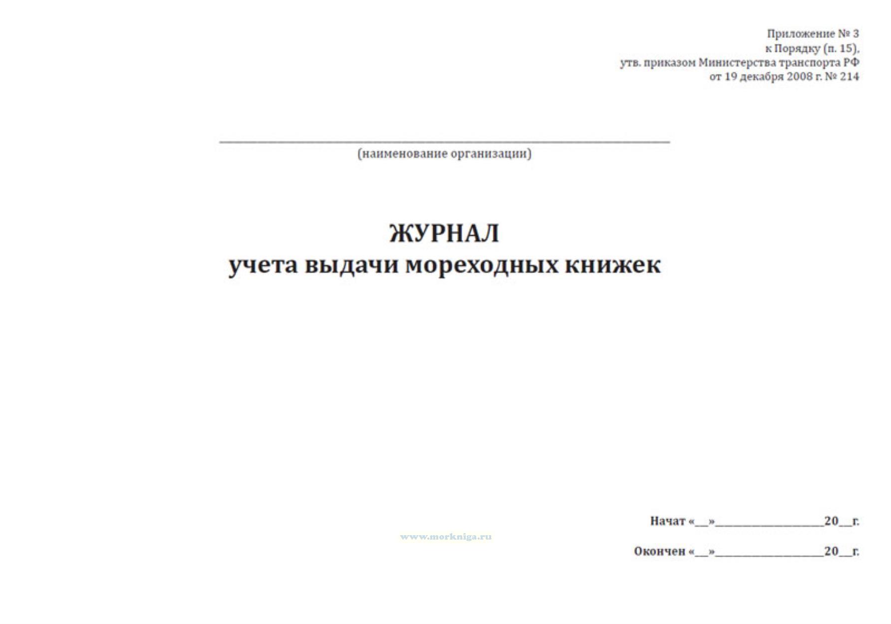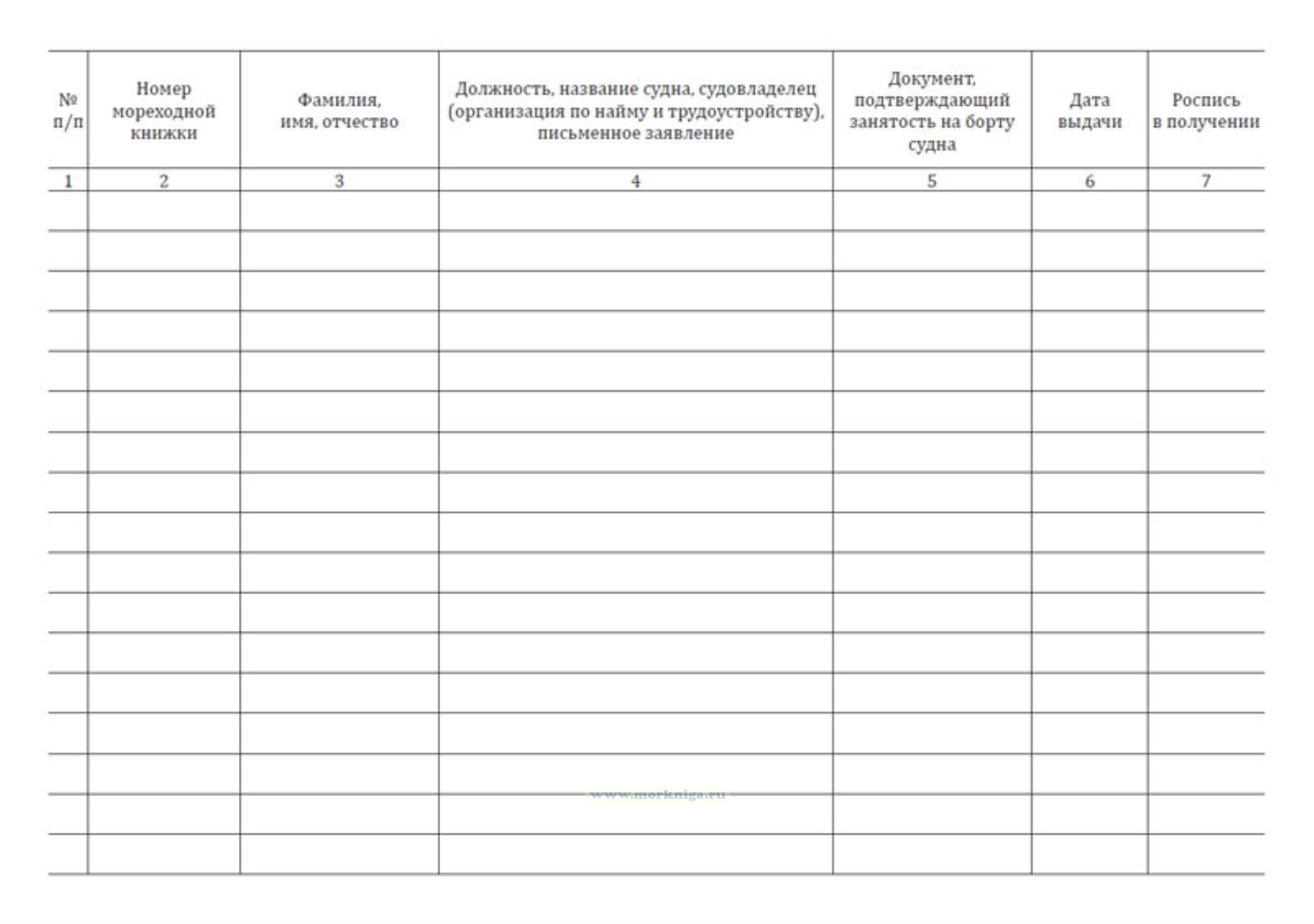 Форма журнала соответствует Приложению N 3 к Приказу Минтранса РФ от 19 декабря 2008 г. N 214 "Об утверждении Порядка оформления, выдачи и ведения мореходной книжки" При получении мореходной книжки заявитель расписывается в журнале. Журнал учета выдачи мореходных книжек имеет графы: 1. № п/п 2. Номер мореходной книжки 3. Фамилия, имя, отчество 4. Должность, название судна, судовладелец (организация по найму и трудоустройству), письменное заявление 5. Документ, подтверждающий занятость на борту судна 6. Дата выдачи 7. Роспись в получении