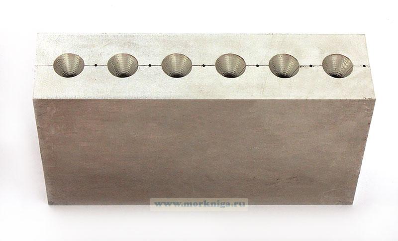 Форма для отливки свинцовых грузил изготовлена из алюминия толщиной 20 мм. Позволяет изготавливать грузила цилиндрической формы (25 г, 30 г, 35 г, 40 г, 45 г, 50 г), а также сферической, весом 20 г. Форма имеет воздушные каналы для качественной отливки.