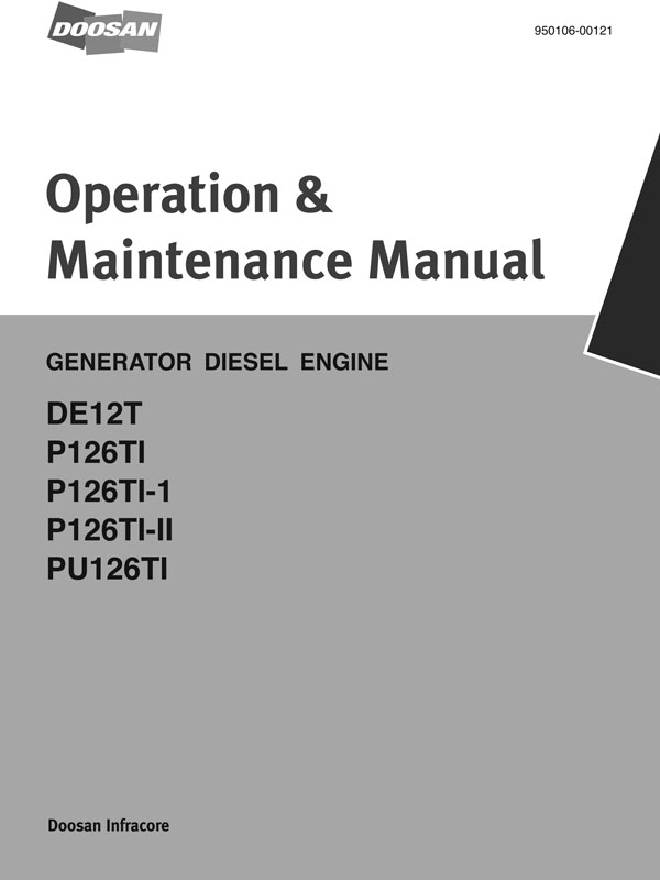 This maintenance manual is designed to serve as a reference for DOOSAN Infracore (here after DOOSAN’s) customers and distributors who wish to gain basic product knowledge on DOOSAN's generator and power unit diesel engines (DE12T, P126TI, P126TI-1, P126TI-II and PU126TI).