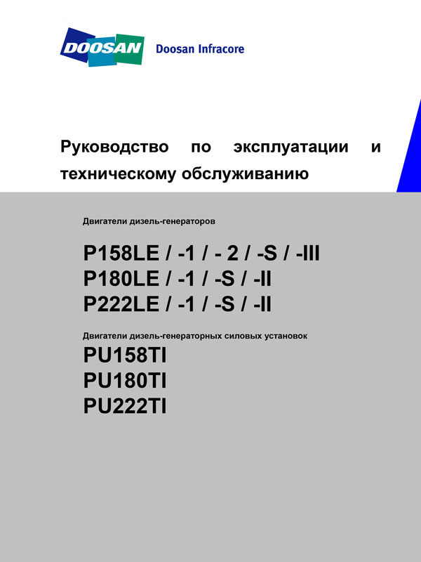 В настоящем руководстве содержатся инструкции по эксплуатации и техническому обслуживанию двигателей DOOSAN дизель-генераторов и дизель-генераторных силовых установок серии P158LE /P180LE /P222LE, PU158TI/ PU180TI/ PU222TI.