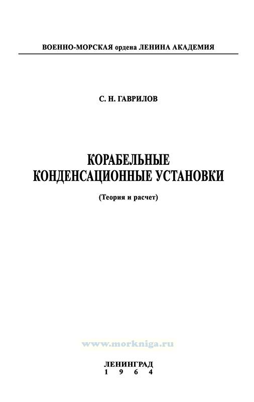 Гл. I посвящена назначению и классификации конденсаторов. В гл. II-VII изложены основные вопросы по теории, экспериментальному исследованию и расчету тепловых и гидродинамических процессов в корабельных поверхностных конденсаторах с принудительной и самопроточной системой циркуляции охлаждающей воды и рассмотрены принципы их рационального проектирования. Значительное внимание при этом обращено на изложение приближенного и детального методов расчета конденсаторов. В гл. VIII приведены теоретические основы расчета пароструйных эжекторов, их расчетные и опытные характеристики, а также экспериментальные данные по исследованию влияния на них отдельных конструктивных параметров. Гл. IX посвящена рассмотрению влияния воздухоудаляющие устройства (эжектора) на условия теплообмена в конденсаторе и работы конденсационной установки на переменных режимах. В гл. X излагаются необходимые сведения о принципе действия, экспериментальных данных и расчете дроссельно-увлажнительного устройства.
