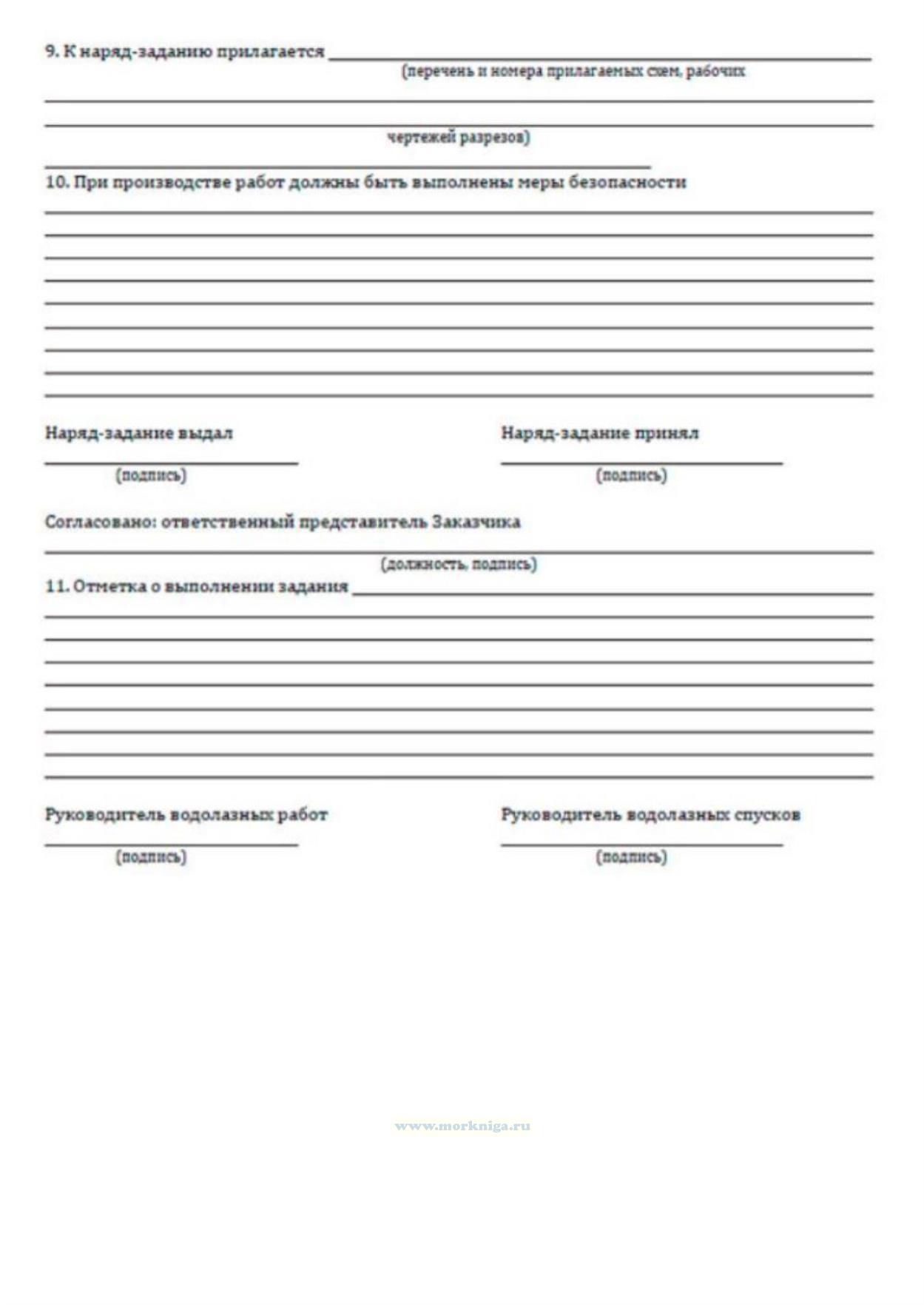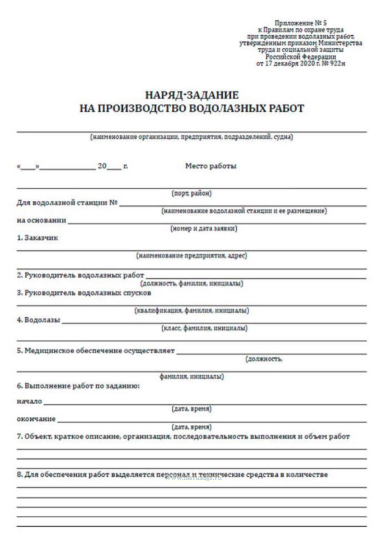 Форма наряда-задания соответствует Приложению № 5 к Правилам по охране труда при проведении водолазных работ.