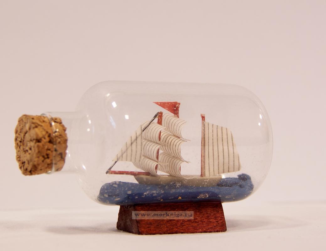Тщательно изготовленный миниатюрный макет корабля аккуратно помещен в прозрачную бутыль. Сувенир станет оригинальным элементом декорирования интерьера.