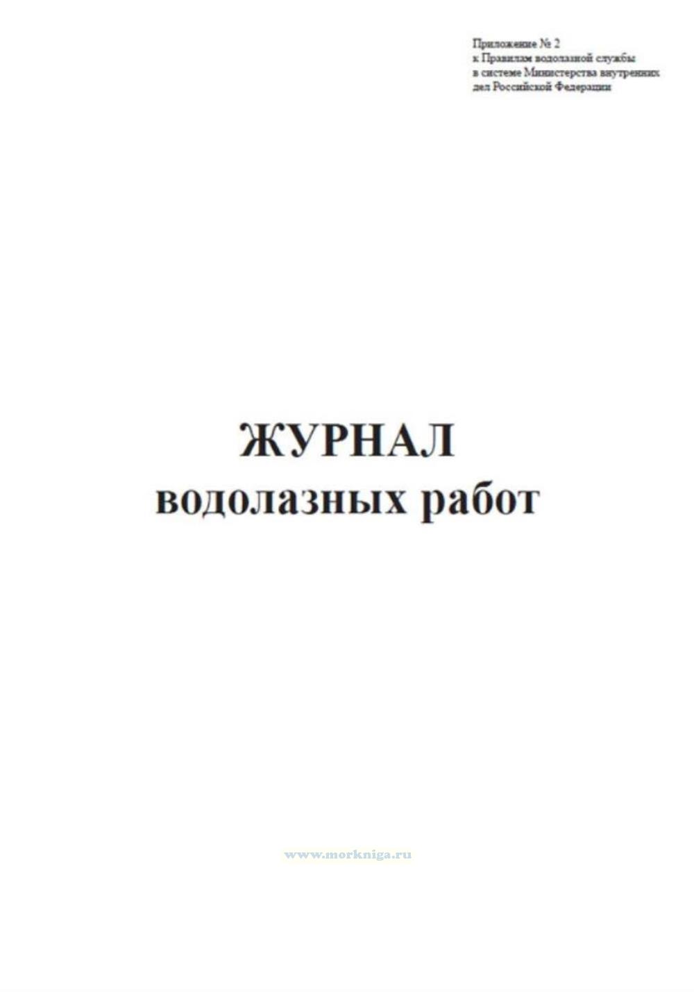 Форма журнал водолазных работ соответствует Приложению 2 к Приказу МВД России № 73 "Об утверждении Правил водолазной службы в системе Министерства внутренних дел Российской Федерации" от 15.02.2011 года.