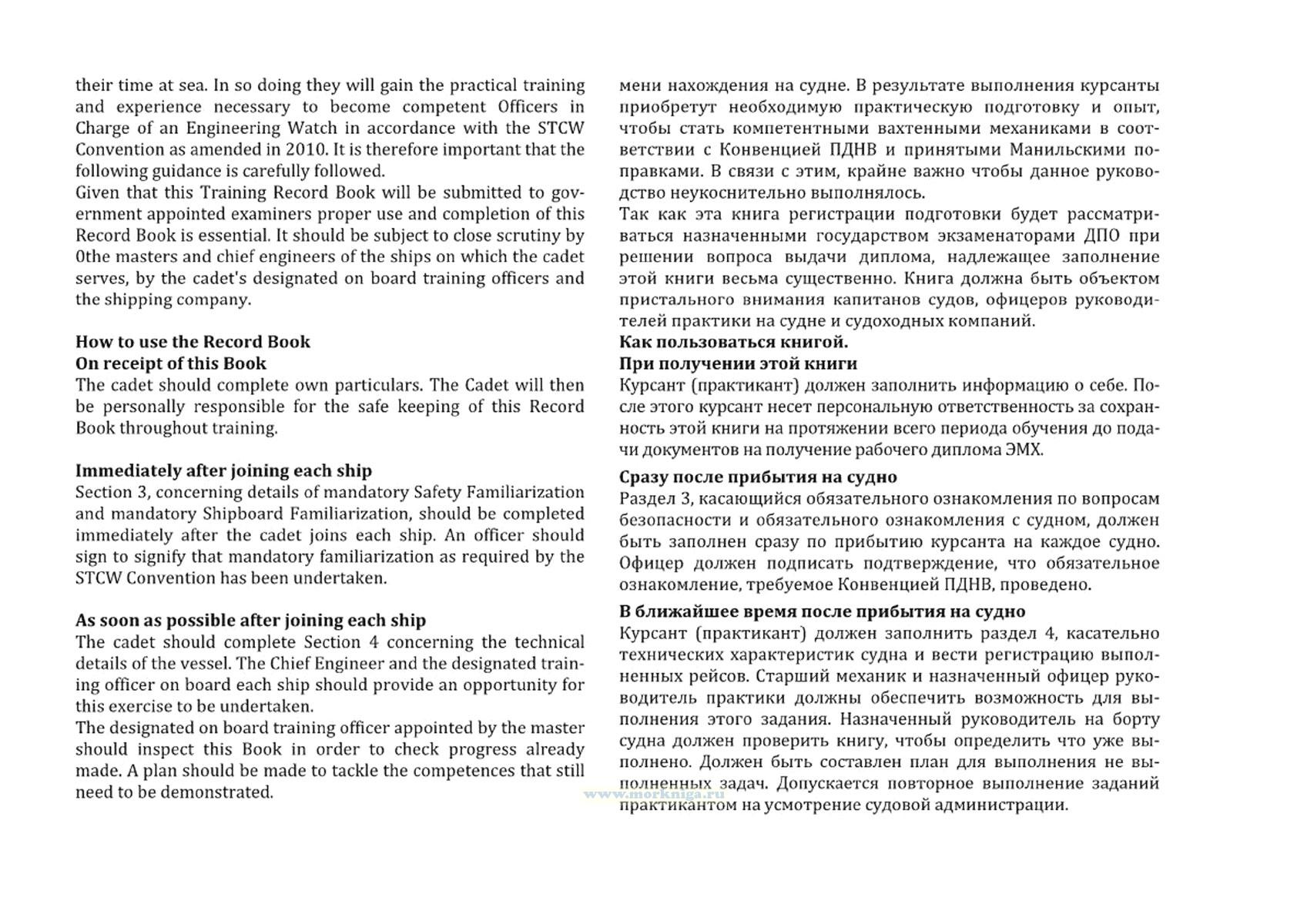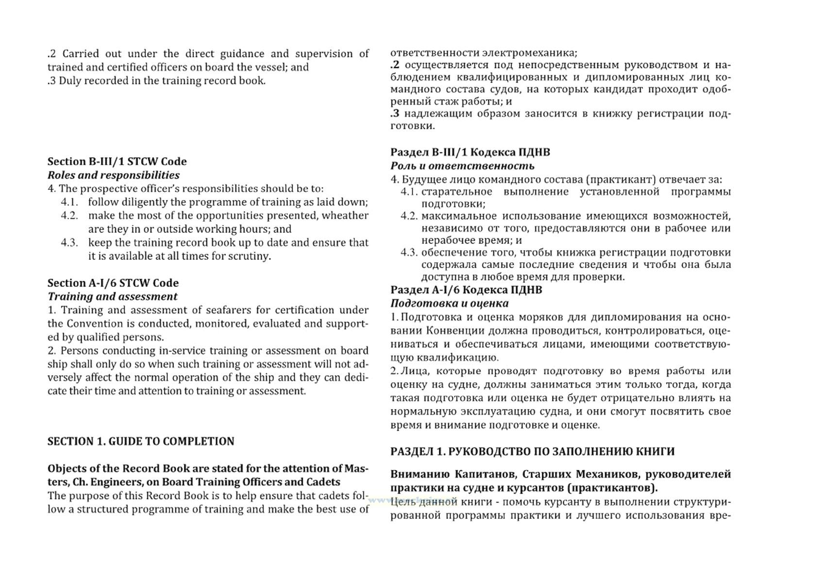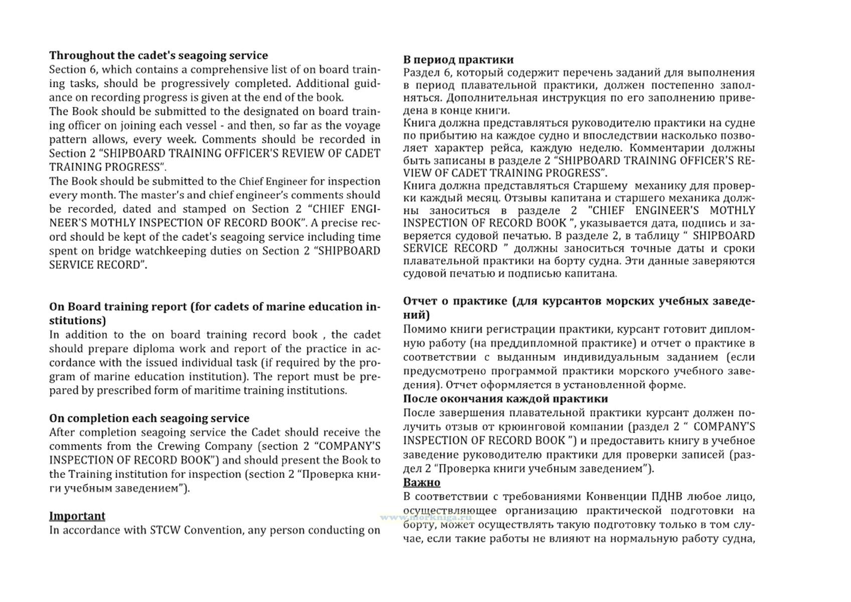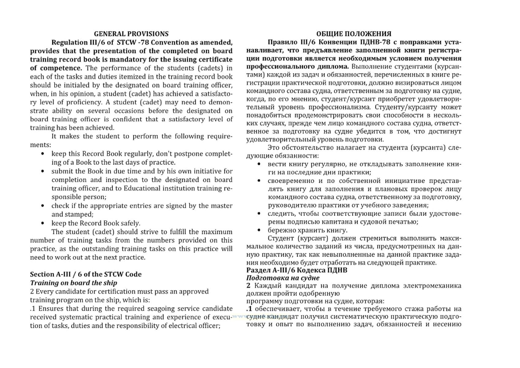 Книга регистрации подготовки представляет подробную информацию о задачах и обязанностях, которые должны выполняться на судах, а также о достигнутом уровне подготовки. Предусмотренная программа подготовки на судне полностью охватывает требования Международной Конвенции ПДНВ-78 с поправками к кандидатам на получение диплома вахтенного механика.