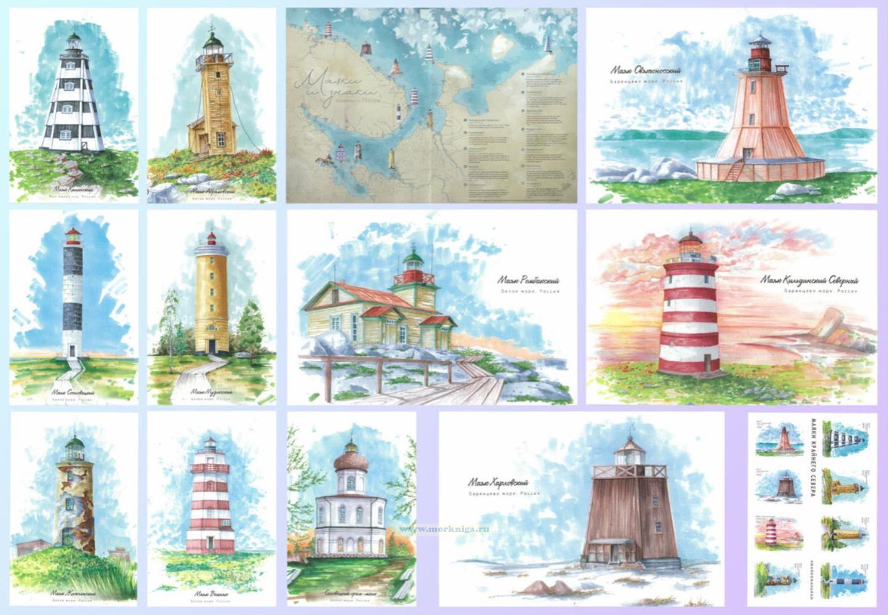 Набор содержит 12 авторских открыток с маяками Белого, Баренцева и Печорского морей, карту маяков с их месторасположением и краткой информацией, стикерпак на 6 декоративных марок.