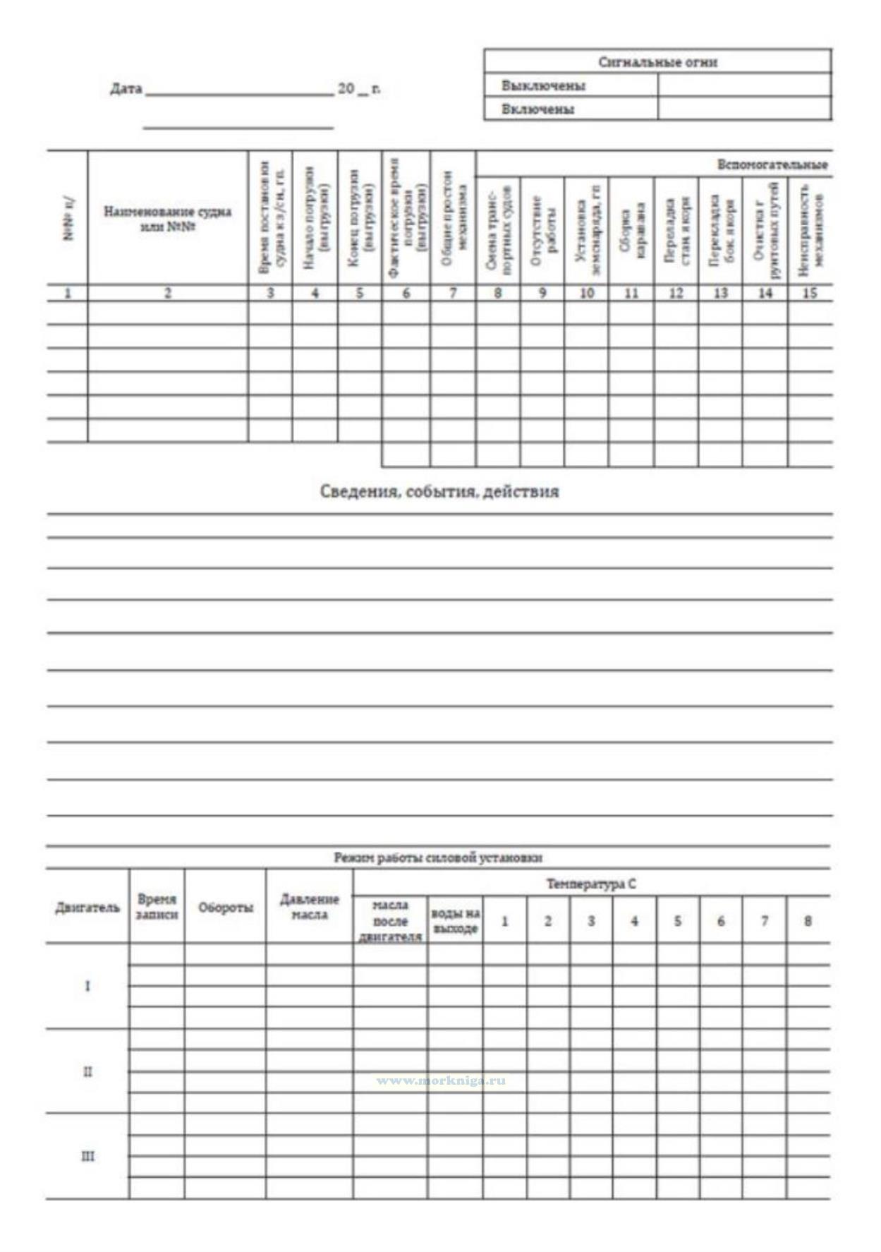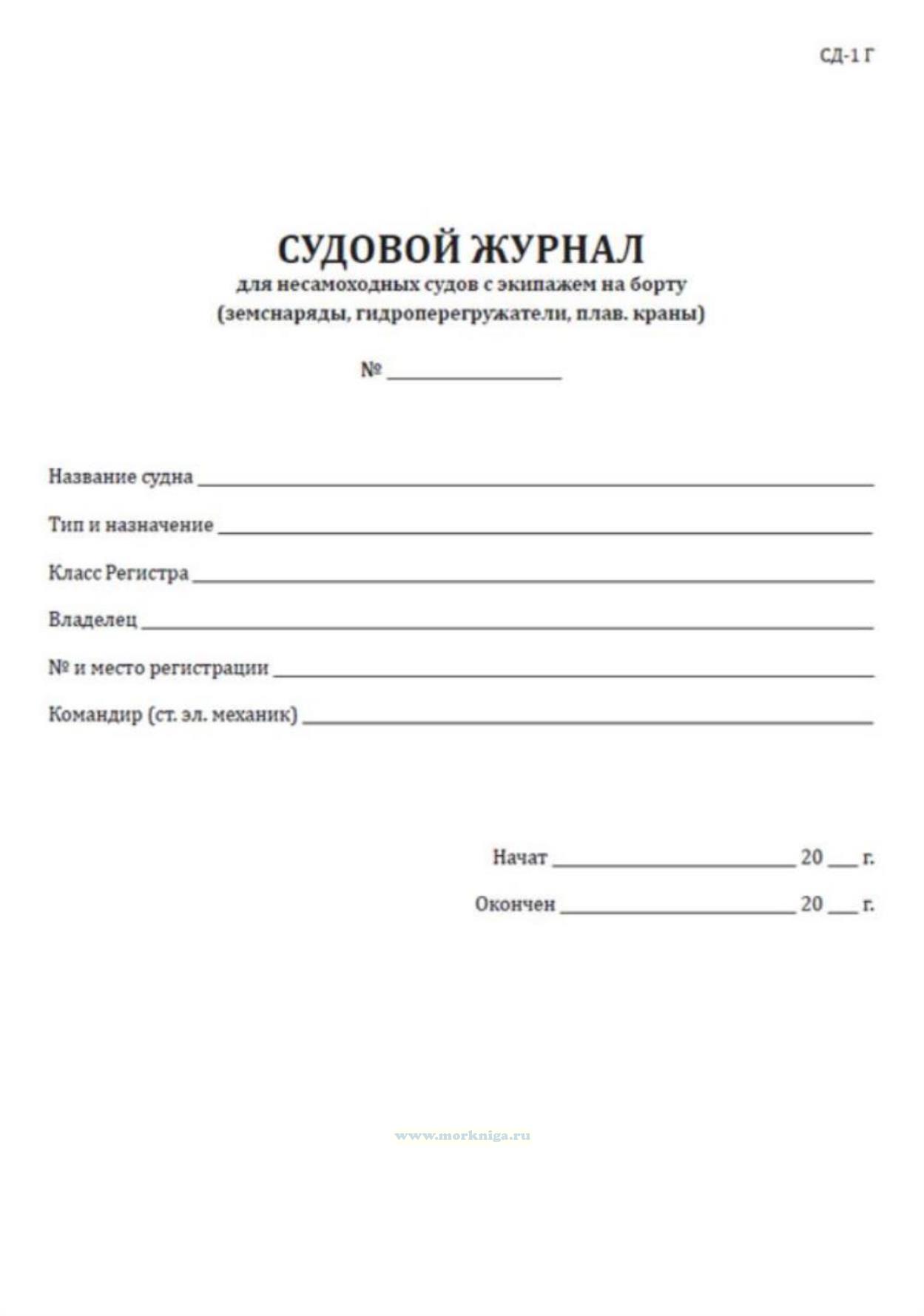 Судовой журнал формы СД-1 Г ведется на каждом несамоходном судне (плавсредстве) с экипажем на борту. Разделы судового журнала для несамоходных судов с экипажем на борту (земснаряды, гидроперегружатели, плав. краны) (Форма СД-1 Г): Сведения, события, действия Режим работы силовой установки Профилактические работы по силовой установке и механизмам Прием и сдача вахты