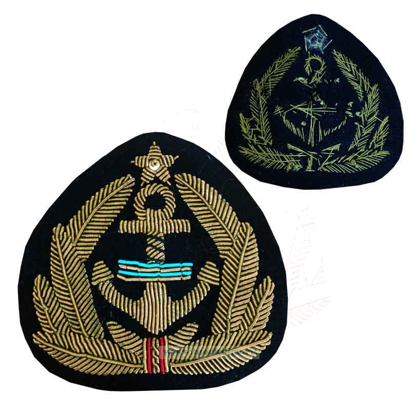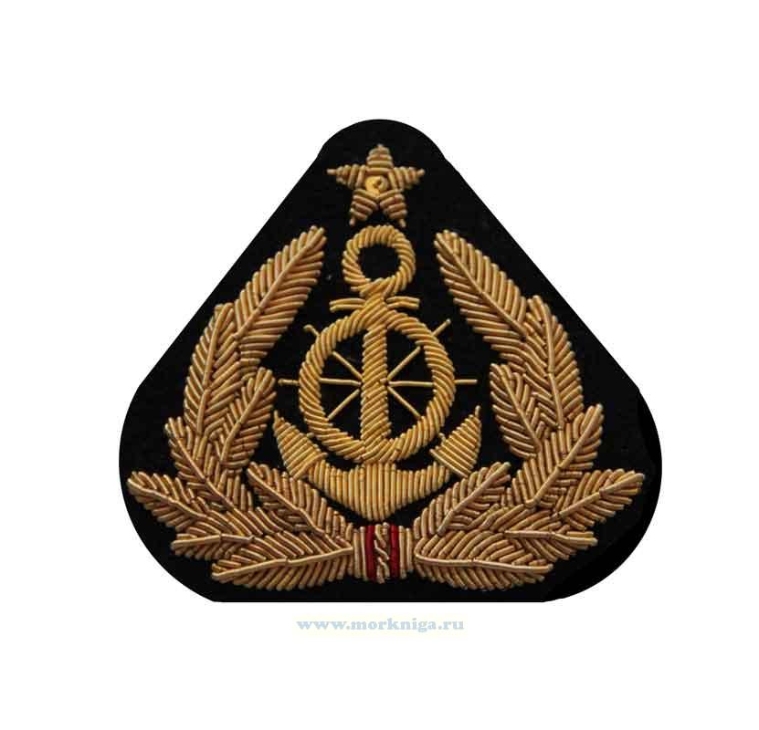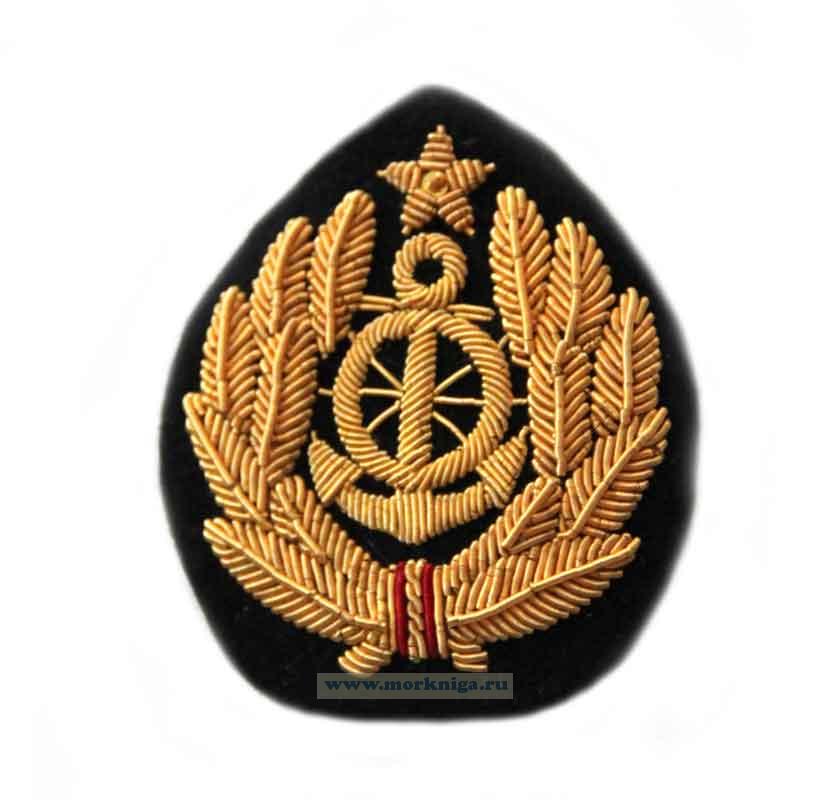 Кокарда для старшего и среднего начальствующего состава речного флота с вышитой эмблемой "штурвал на якоре в виньетке из листьев, над рымом якоря – пятиконечная звезда".