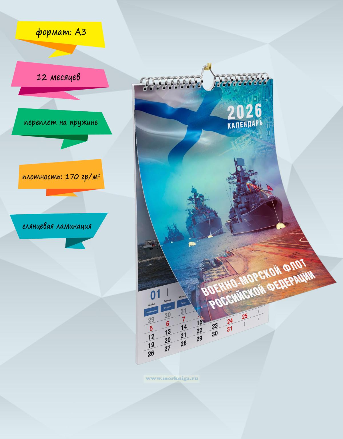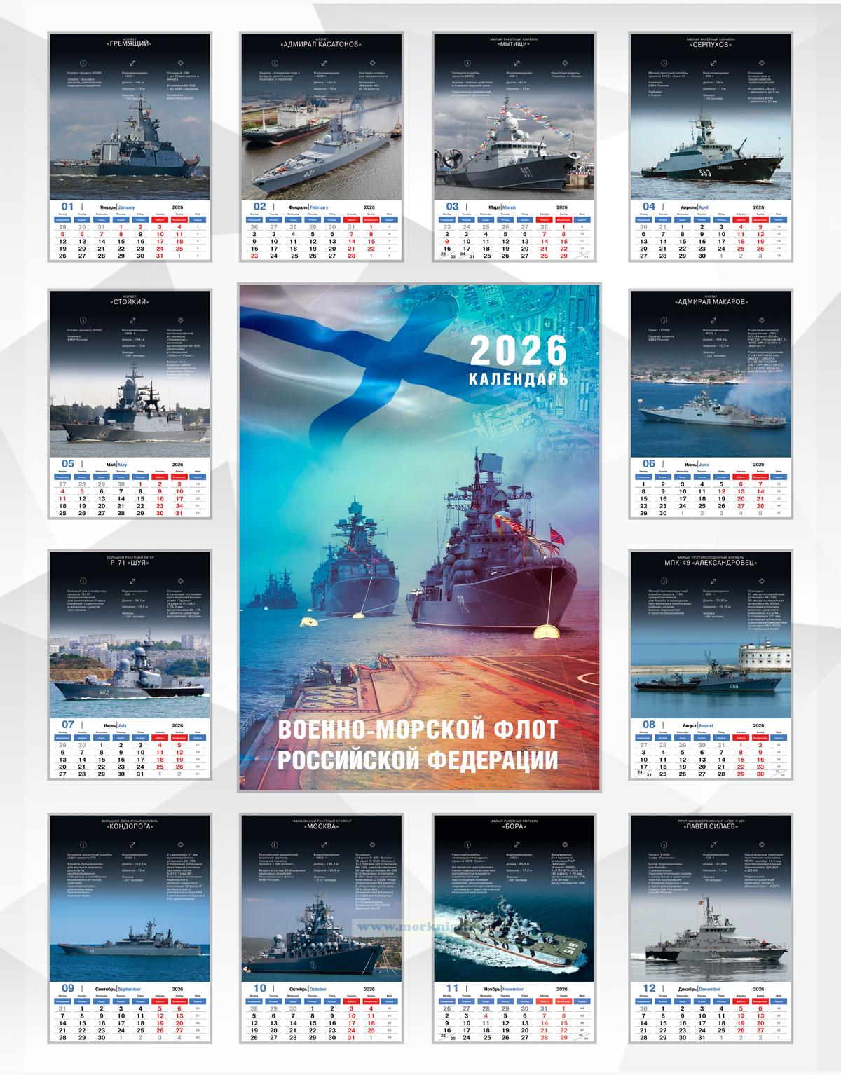 Календарь содержит 12 изображений представителей Военно-морского флота Российской Федерации с кратким описанием характеристик: