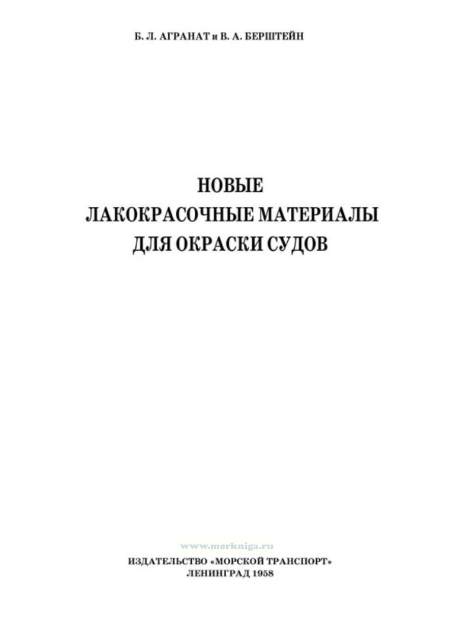В настоящей брошюре приводится краткое описание новых лакокрасочных материалов на синтетической основе, применяемых или имеющих перспективу использования для окраски судов в СССР и за рубежом.