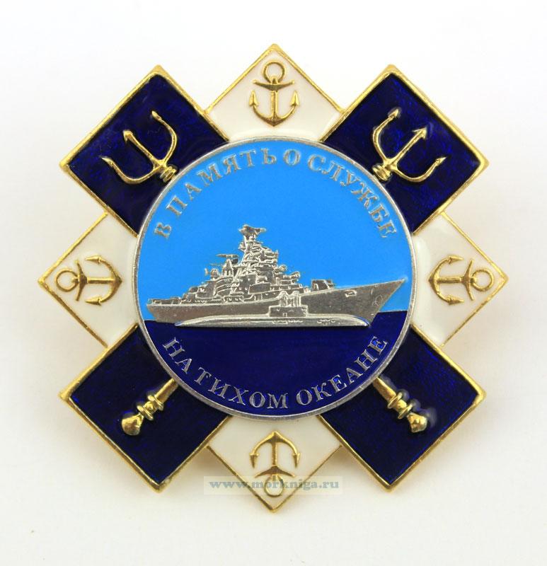 Нагрудный знак «В память о службе на Тихом океане» выполнен в форме ромба белого цвета с изображением якорей в каждом углу, поверх которого по диагонали крест-накрест расположены прямоугольники синего цвета с изображением трезубца. По центру знака находится круг с изображением корабля и надписью по окружности: «В память о службе на Тихом океане».