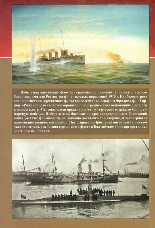 На фоне тяжелых неудач особенно ярко выделяется победа над германским флотом в сражении за Рижский залив. Победа в этой баталии не продемонстрировала блестящий гений русских флотоводцев, но законно досталась той стороне, что совершила наименьшее количество ошибок. После провала Ирбенской операции в Рижском заливе активные действия германского флота в Балтийском море прекратились более чем на два года.