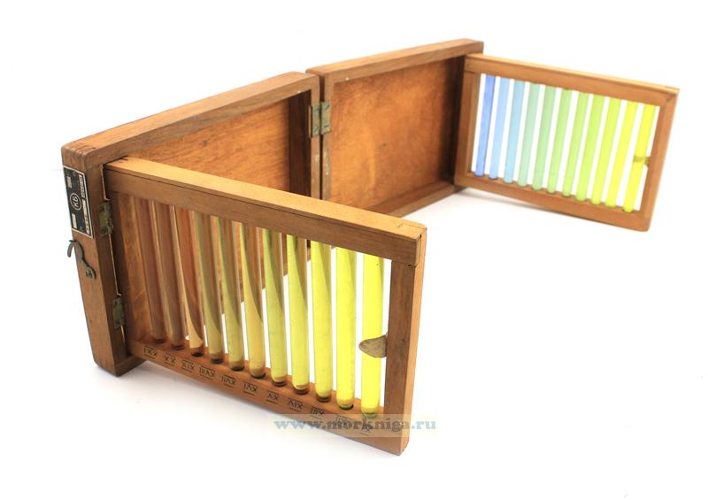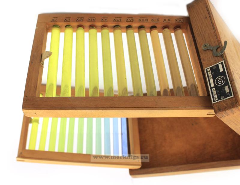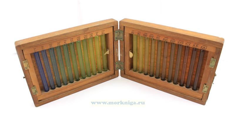 Шкала цветности состоит из двадцати двух стеклянных запаянных пробирок, наполненных цветными растворами с постепенным переходом от синего к коричневому.