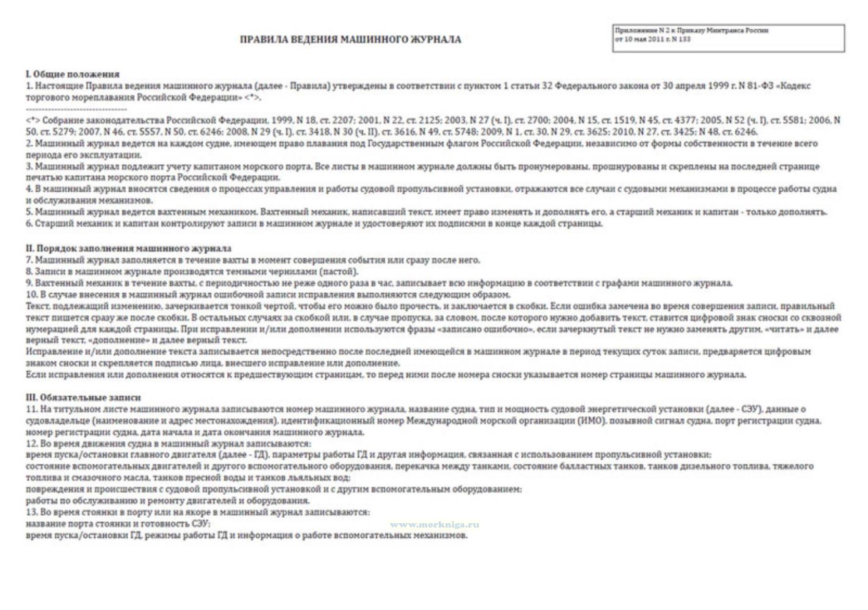 1. Настоящие Правила ведения машинного журнала утверждены в соответствии с пунктом 1 статьи 32 Федерального закона от 30 апреля 1999 г. N 81-ФЗ «Кодекс торгового мореплавания Российской Федерации».