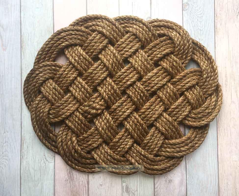 На изготовление коврика было использовано 25 метров манильского каната, который является 100% натуральным продуктом, без каких либо дополнительных включений. Не гниет и не плесневеет. Применяться может в любых помещения и на открытом воздухе.