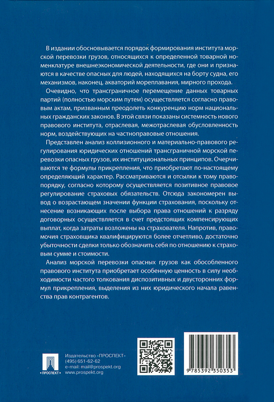 В издании обосновывается порядок формирования института морской перевозки грузов, относящихся к определенной товарной номенклатуре внешнеэкономической деятельности, где они и признаются в качестве опасных для людей, находящихся на борту судна, его механизмов, наконец, акваторий мореплавания, мирного прохода.