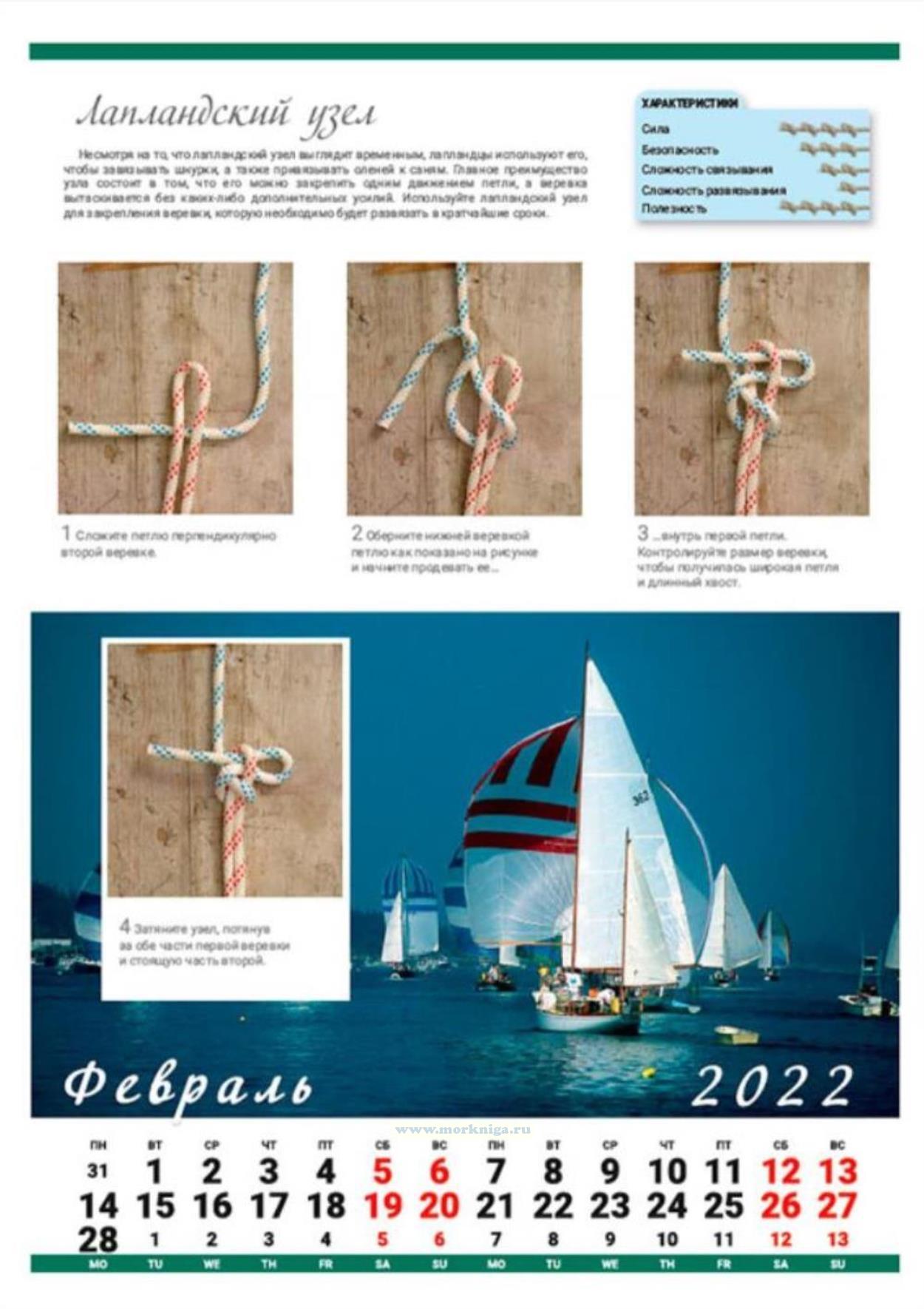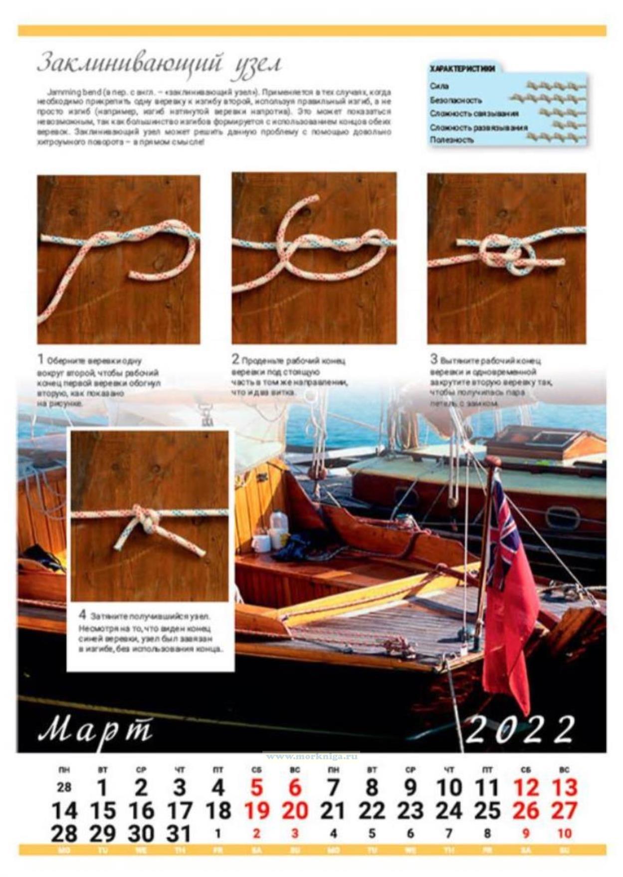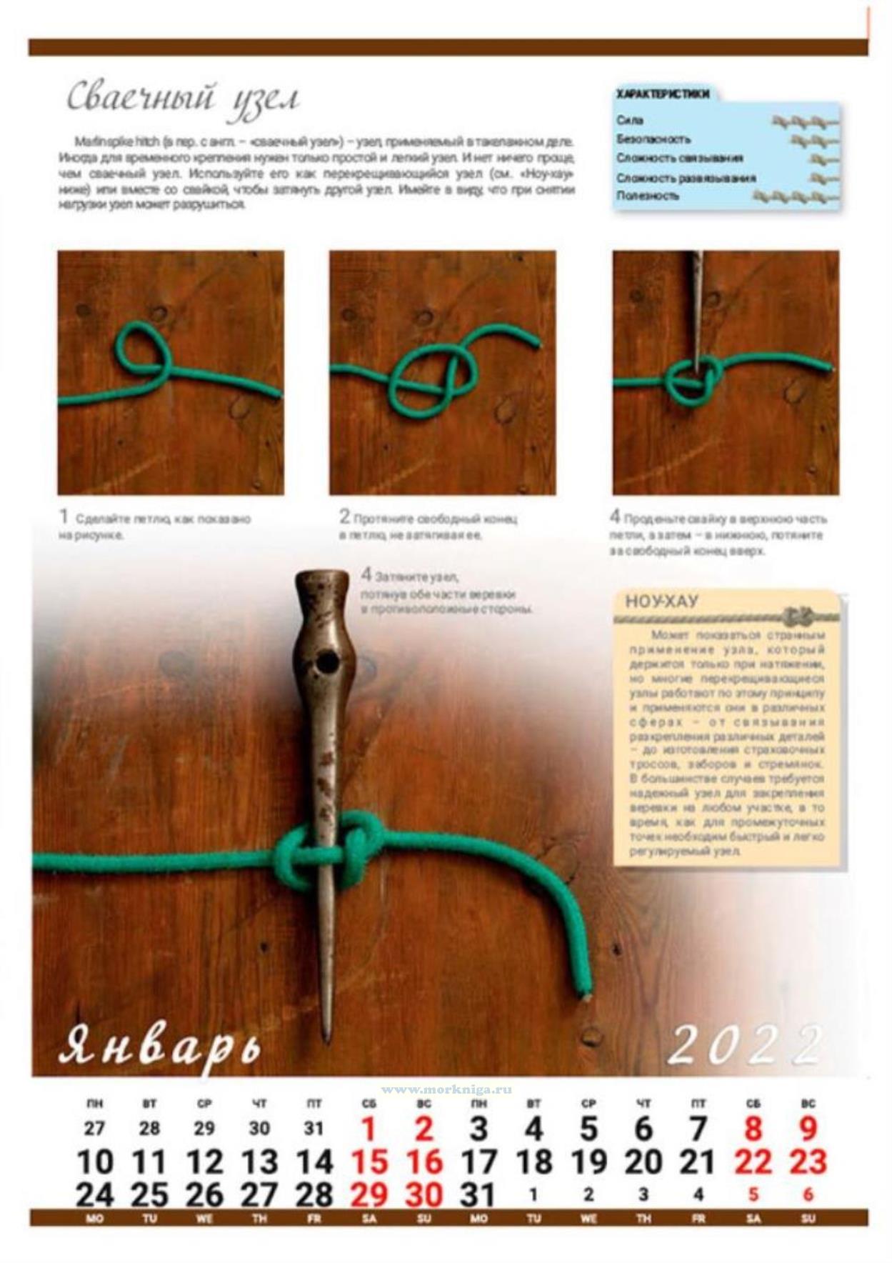 На календаре представлены 12 изображений морских узлов с описанием, характеристиками и способами завязывания: