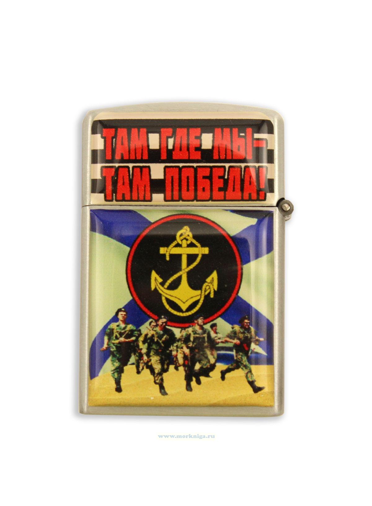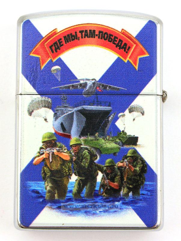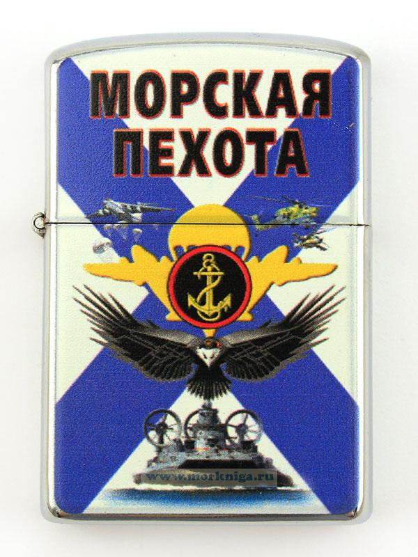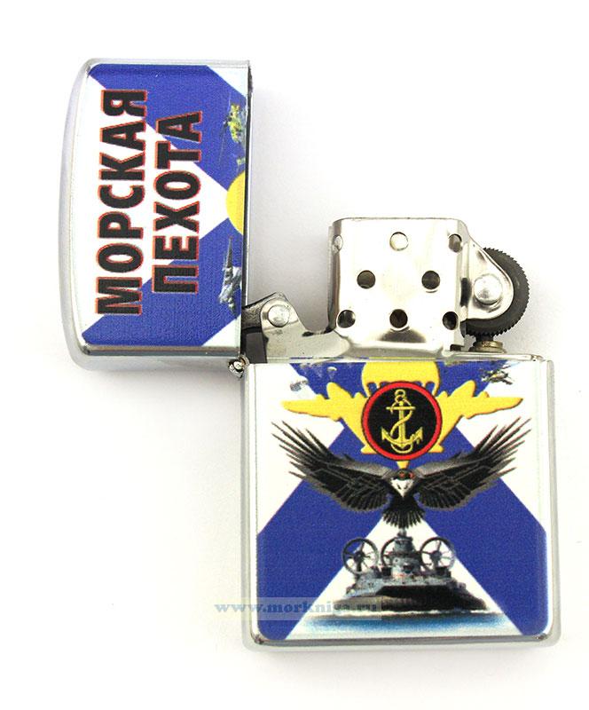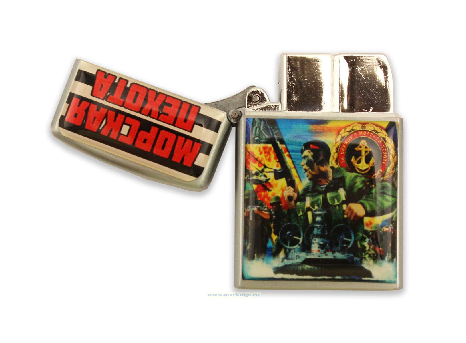 Газовая зажигалка с ярким тематическим оформлением "Морская пехота". На корпус нанесены изображения бойцов и символика рода войск, выполненные в насыщенных цветах. Турбо-механизм обеспечивает устойчивое, мощное пламя, которое не гаснет на ветру. Зажигалка предназначена для повседневного использования и часто применяется как сувенир или подарочный аксессуар в военной стилистике.