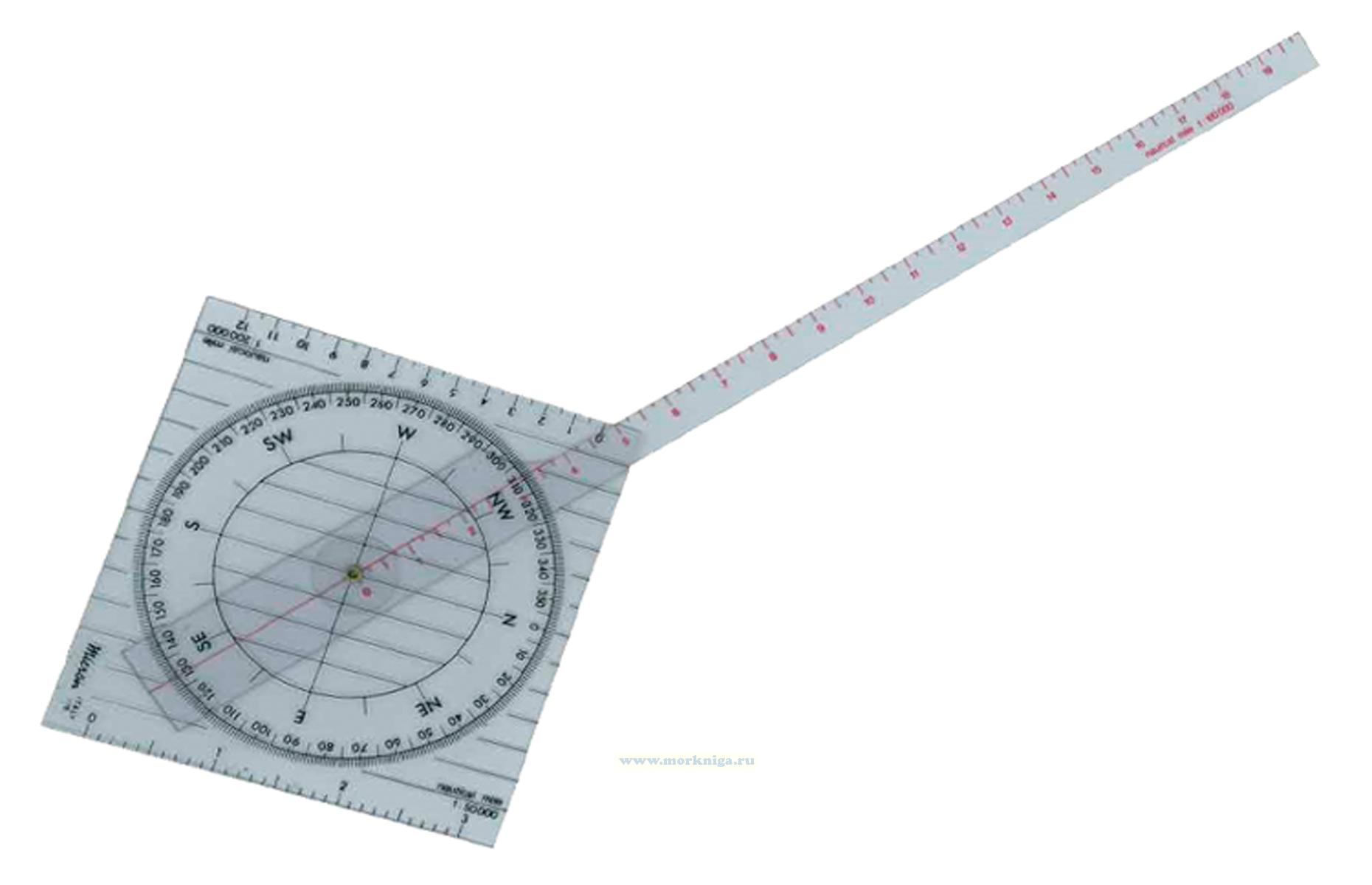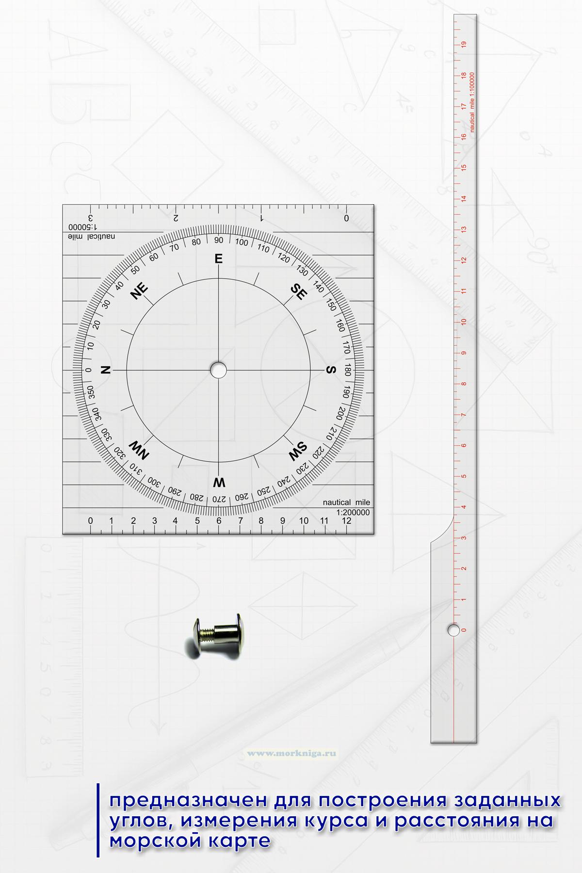 Предназначен для построения заданных углов, измерения курса и расстояния на морской карте. Кроме прозрачной пластины с нанесенной прямоугольной сеткой он имеет вращающийся диск, маркированный как картушка компаса, и поворачивающуюся линейку.