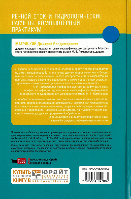 В учебном пособии представлены приемы расчетов речного стока с использованием специализированных компьютерных программ. В нем подробно описана работа с программами Microsoft Excel, StokStat, HydroStatCalc и «Гидрорасчеты», а также методы расчетных гидрологических характеристик при отсутствии данных гидрометрических наблюдений.