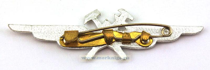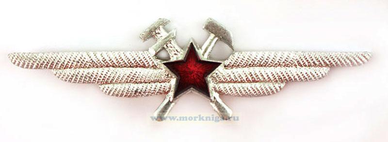 Нагрудный знак представляет собой изображение развернутых крыльев посредине которых расположены скрещенные раздвижной ключ и молоток, а поверх их пятиконечная звезда, покрытая рубиново-красной эмалью.