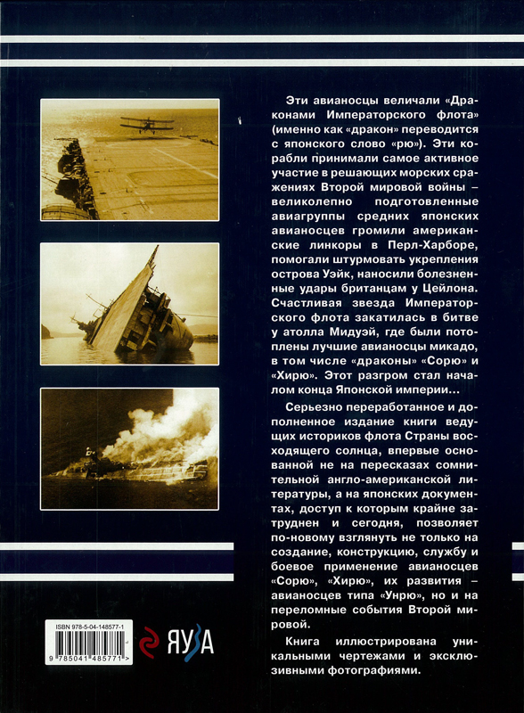 Серьезно переработанное и дополненное издание книги ведущих историков флота Страны восходящего солнца, впервые основанной не на пересказах сомнительной англо-американской литературы, а на японских документах, доступ к которым крайне затруднен и сегодня, позволяет по-новому взглянуть не только на создание, конструкцию, службу и боевое применение авианосцев «Сорю» и «Хирю», их развитие - авианосцев типа «Унрю», но и на переломные события Второй мировой.