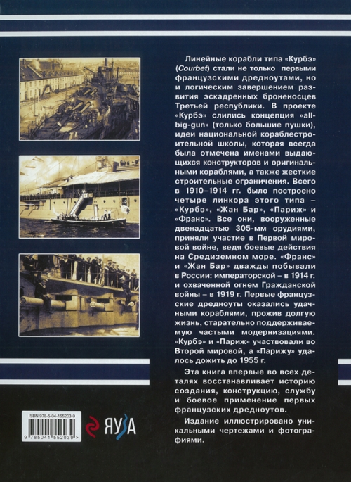 Линейные корабли типа «Курбэ» (Courbet) стали не только первыми французскими дредноутами, но и логическим завершением развития эскадренных броненосцев Третьей республики. В проекте «Курбэ» слились концепция «allbig-gun» (только большие пушки), идеи национальной кораблестроительной школы, которая всегда была отмечена именами выдающихся конструкторов и оригинальными кораблями, а также жесткие строительные ограничения. Всего в 1910-1914 гг. было построено четыре линкора этого типа - «Курбэ», «Жан Бар», «Париж» и «Франс». Все они, вооруженные двенадцатью 305-мм орудиями, приняли участие в Первой мировой войне, ведя боевые действия на Средиземном море. «Франс» и «Жан Бар» дважды побывали в России: императорской - в 1914 г. и охваченной огнем Гражданской войны - в 1919 г. Первые французские дредноуты оказались удачными кораблями, прожив долгую жизнь, старательно поддерживаемую частыми модернизациями. «Курбэ» и «Париж» участвовали во Второй мировой, а «Парижу» удалось дожить до 1955 г.