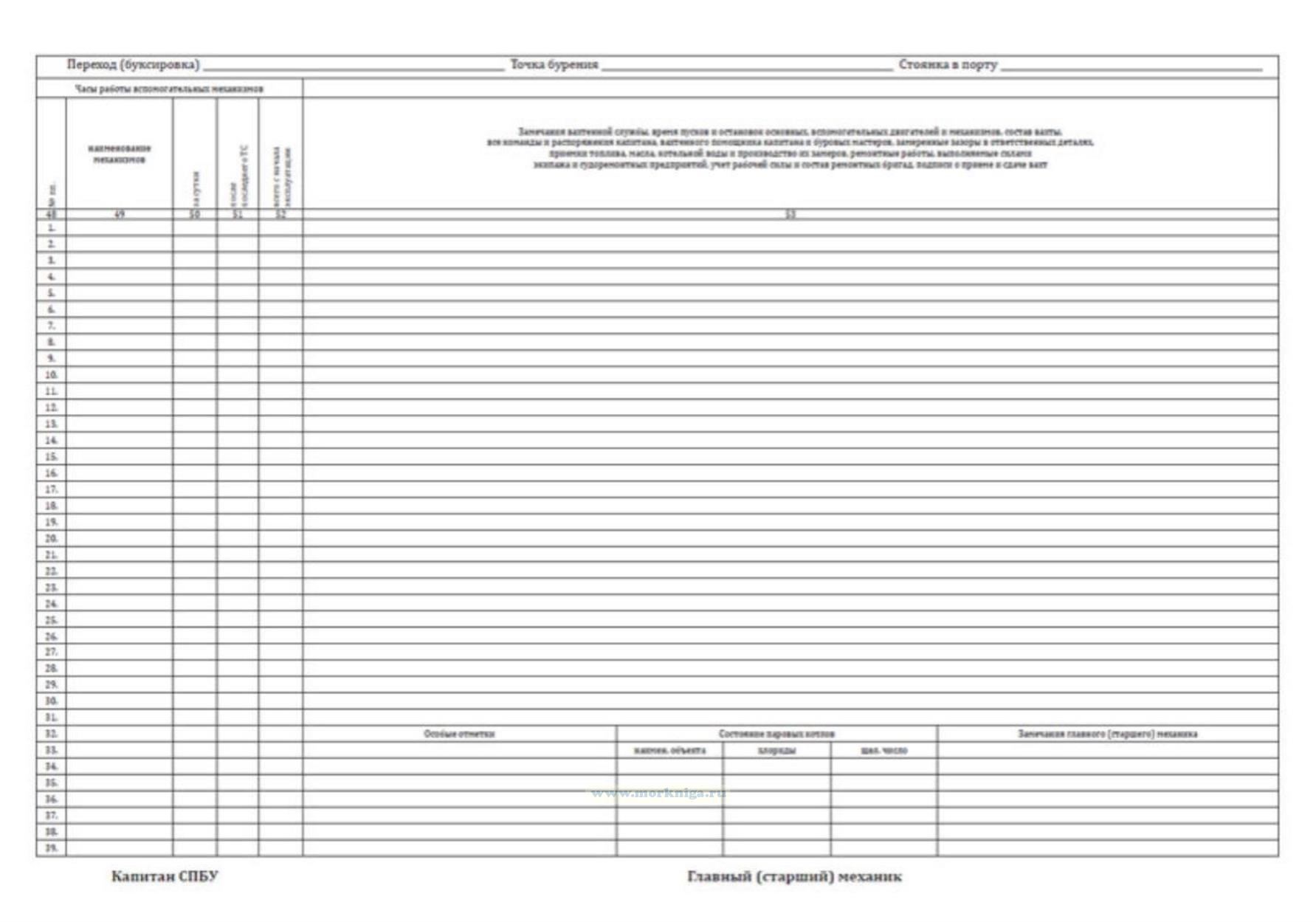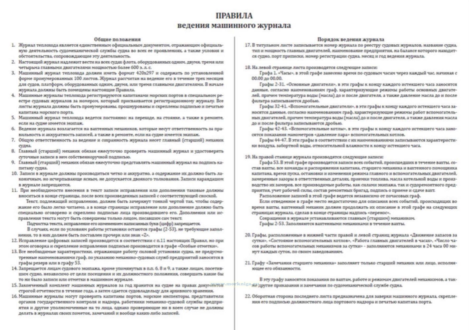 6. Ведение журнала возлагается на вахтенных механиков, которые несут ответственность за правильность и аккуратность записей, а также в ремонте, если на судне имеется экипаж.
