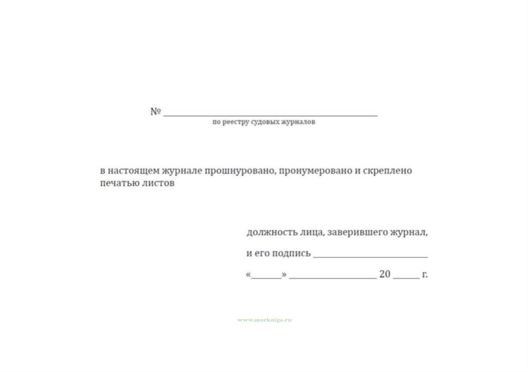4. Машинные журналы теплохода регистрируются капитанами морских портов в специальном реестре судовых журналов за номером, который присваивается регистрационному журналу. Все листы журнала должны быть пронумерованы, прошнурованы и скреплены подписью и печатью капитана морского порта.