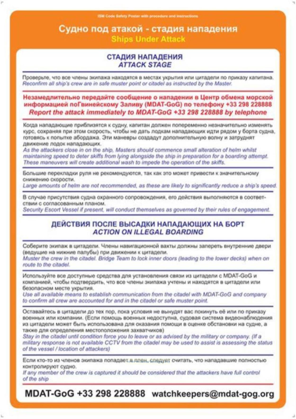 Плакат на русском и английском языкахПлакат информирует и напоминает о необходимых действиях в случае атаки судна в стадии нападения.Материал: самоклеящаяся бумагаФормат: А3 (297x420 мм)