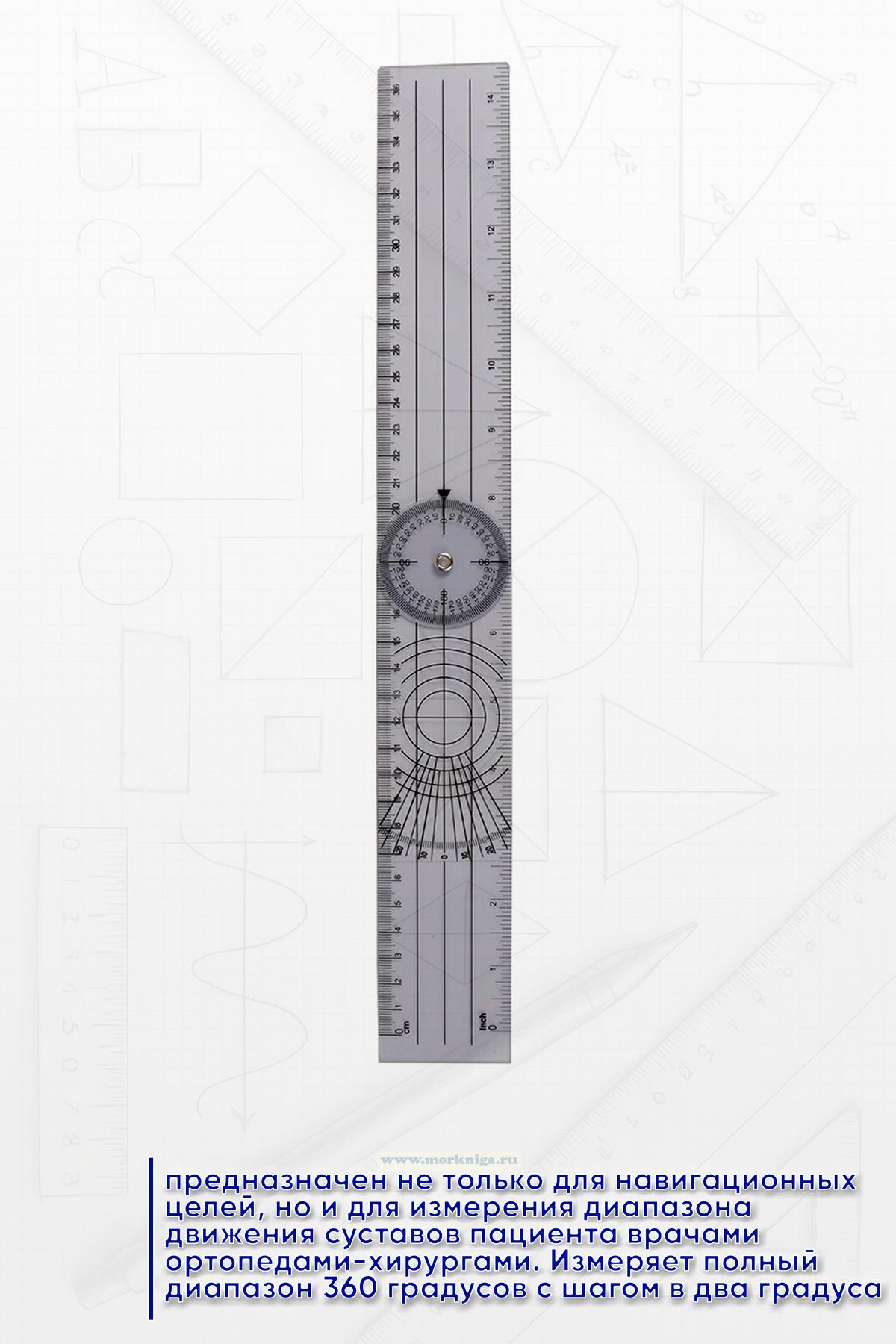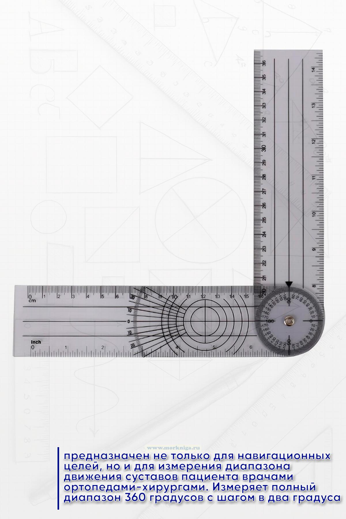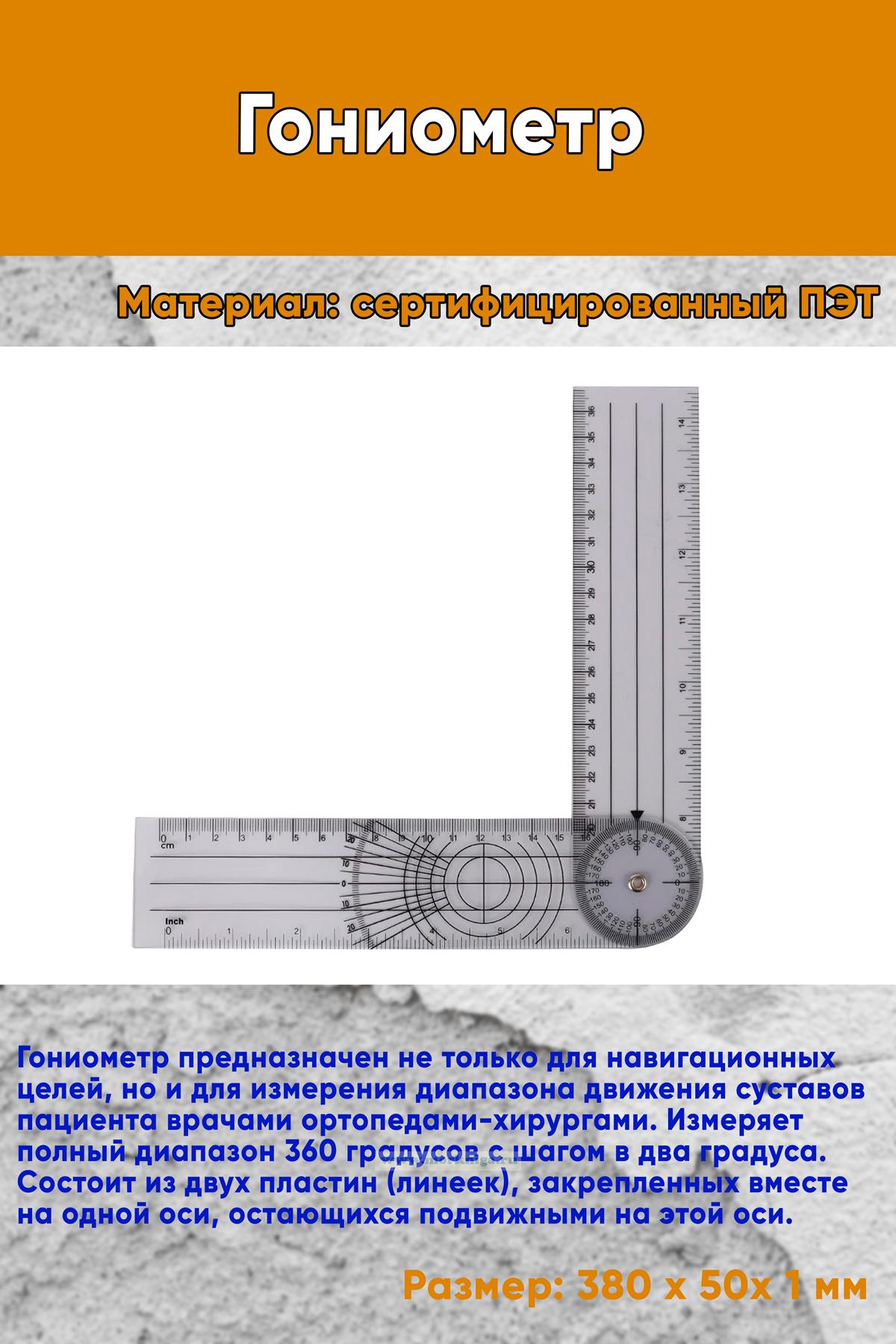 Гониометр предназначен не только для навигационных целей, но и для измерения диапазона движения суставов пациента врачами ортопедами-хирургами. Измеряет полный диапазон 360 градусов с шагом в два градуса. Состоит из двух пластин (линеек), закрепленных вместе на одной оси, остающихся подвижными на этой оси.