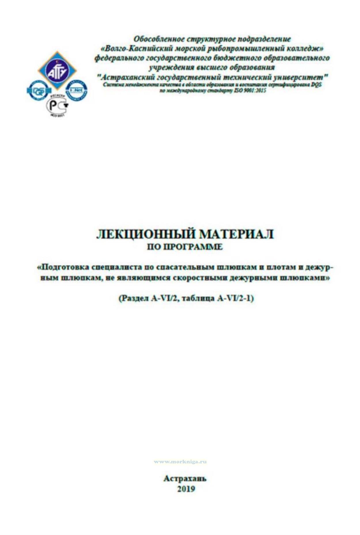 Программа подготовки «Специалист по спасательным шлюпкам, спасательным плотам и дежурным шлюпкам, не являющимися скоростными дежурными шлюпками» содержит обязательные минимальные требования для дипломирования специалистов по спасательным шлюпкам, спасательным плотам и дежурным шлюпкам, не являющимися скоростными дежурными шлюпками как определено в Правиле VI/2 МК ПДНВ 78 с поправками. Компетентность, в соответствии со спецификацией, представленной в таблице А-VI/2-1 Кодекса ПДНВ, должна быть достаточной для выполнения спуска и командования спасательной шлюпкой, спасательным плотом или дежурной шлюпкой в аварийных ситуациях, а также управления шлюпкой на вёслах, под механическим двигателем, использования надувного спасательного плота.