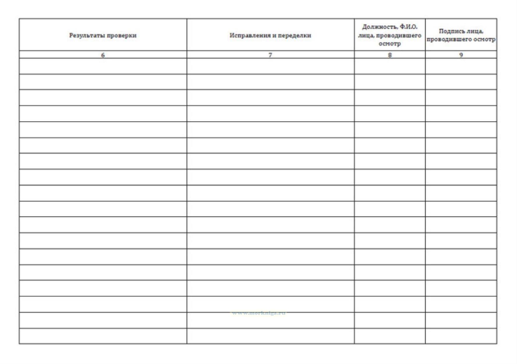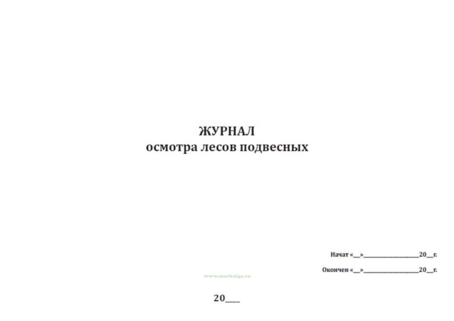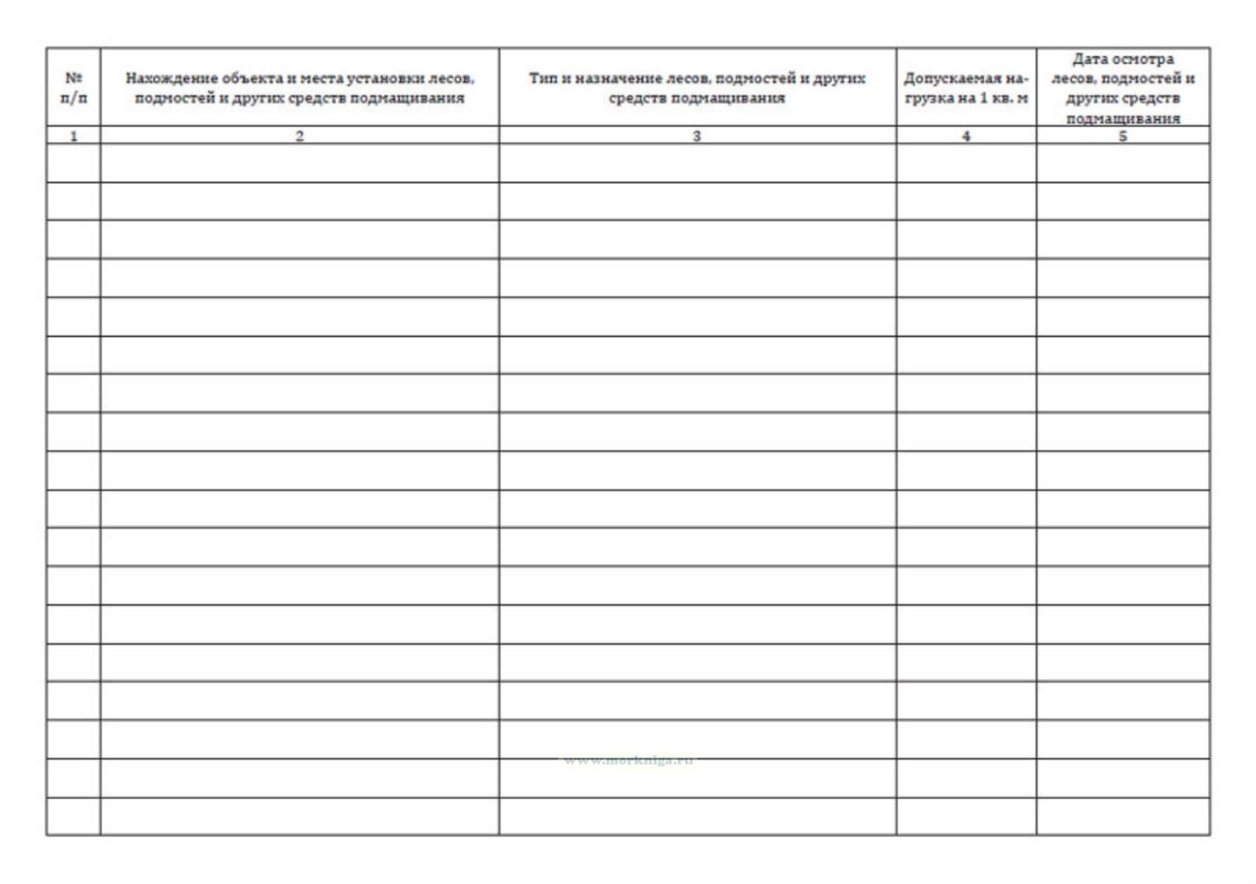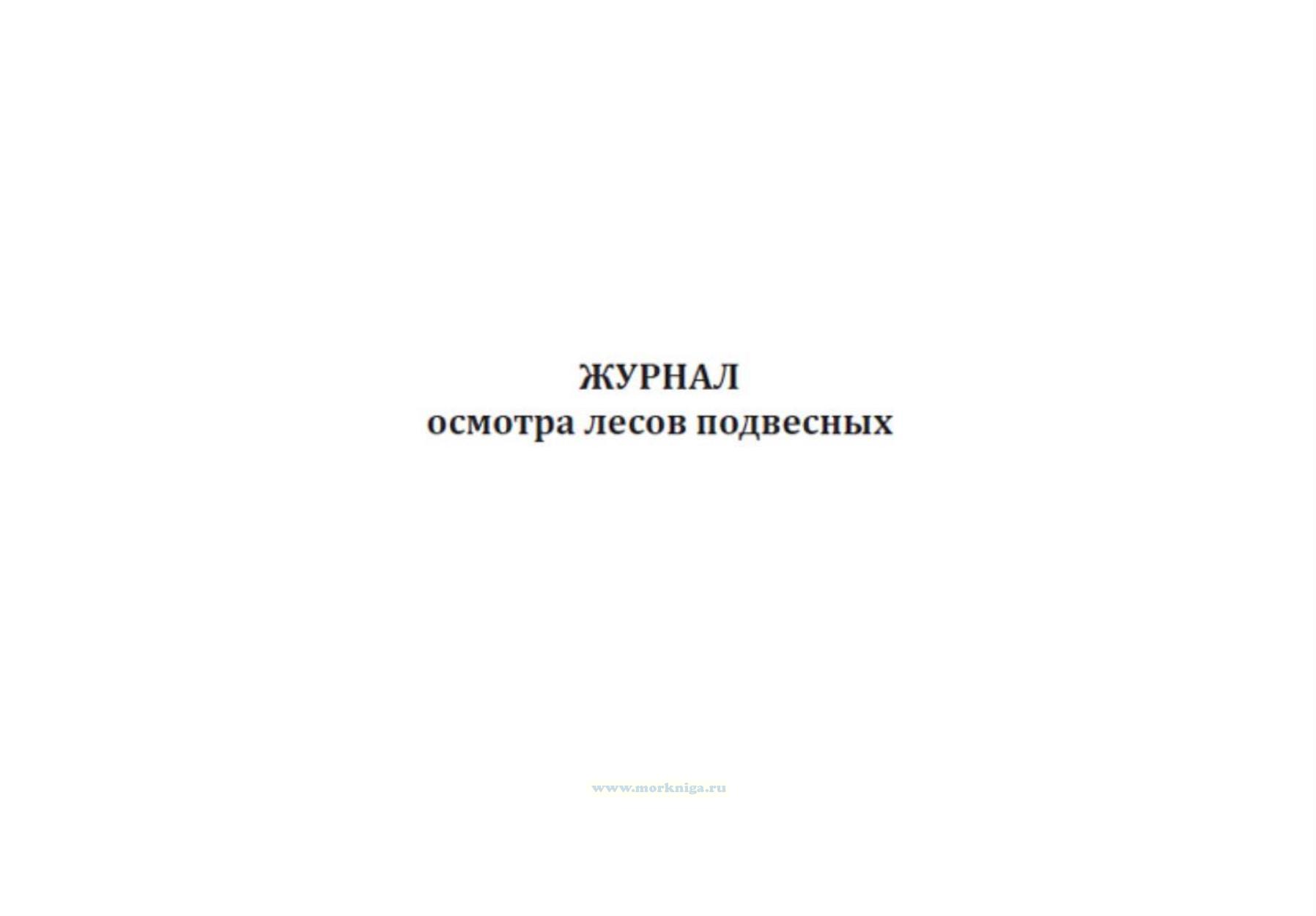 Для записи результатов осмотра подвесных лесов используют журнал. Графы журнала осмотра лесов подвесных: 1. № п/п 2. Нахождение объекта и места установки лесов, подмостей и других средств подмащивания 3. Тип и назначение лесов, подмостей и других средств подмащивания 4. Допускаемая нагрузка на 1 кв. м 5. Дата осмотра лесов, подмостей и других средств подмащивания 6. Результаты проверки 7. Исправления и переделки 8. Должность, Ф.И.О. лица, проводившего осмотр 9. Подпись лица, проводившего осмотр